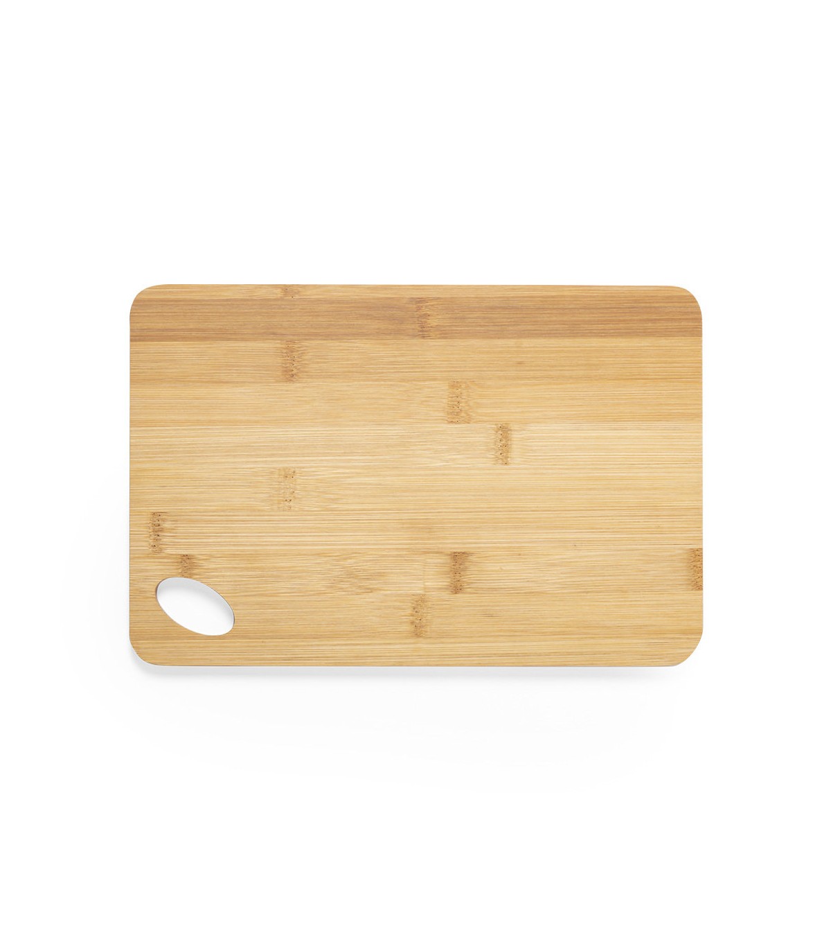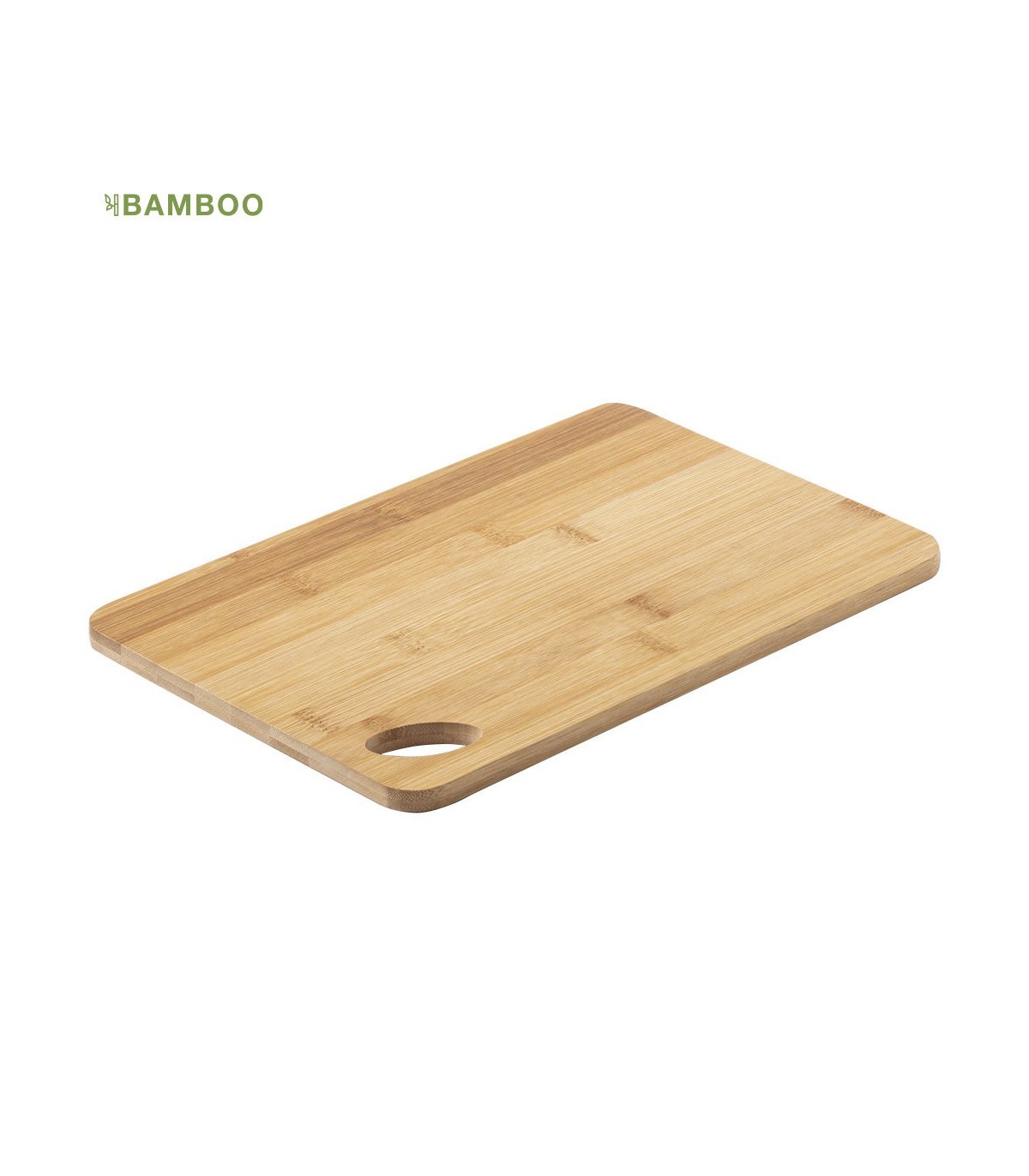 Tabla de fabricación ecológica elaborada en bambú pulido, ideal para corte y presentación, con troquel para fácil manejo y para colgar.