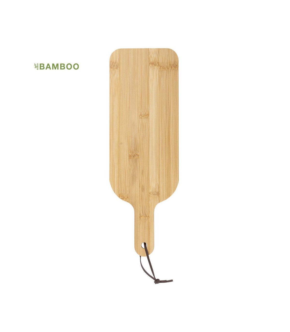 Tabla fabricada en bambú, de suave y resistente acabado pulido. Ideal para corte y presentación. Con asa para fácil manejo y cordón para colgar en símil piel.