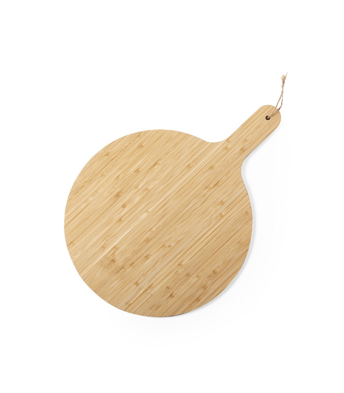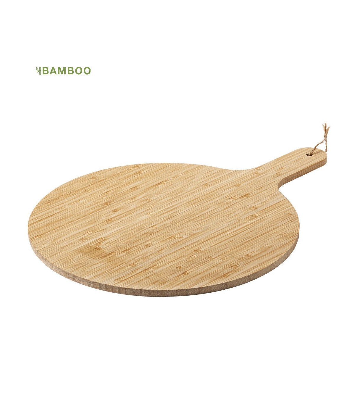 Tabla de fabricación ecológica elaborada en bambú pulido, ideal para presentación, con asa para fácil manejo y cordón para colgar en yute.