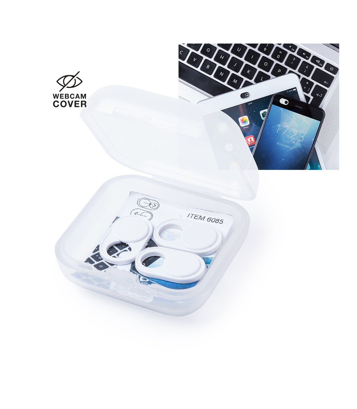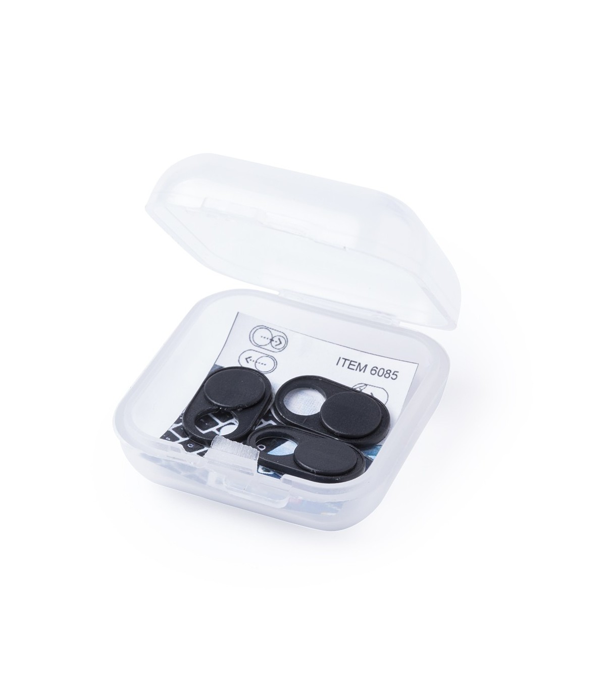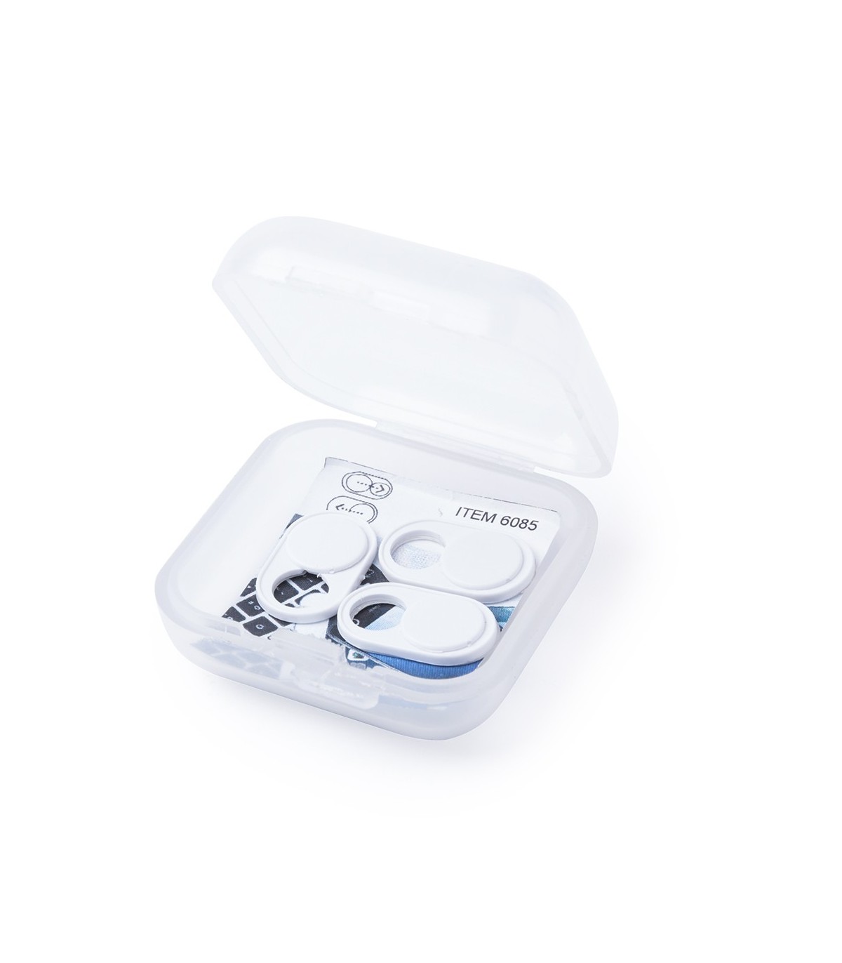 Tapa para cámara de dispositivo móvil para proteger la privacidad. En tamaño ultra compacto y servida en estuche individual de achado translúcido con 3 piezas. Disponible en colores blanco y negro, set presentado en bolsita individual con cartulina de diseño.