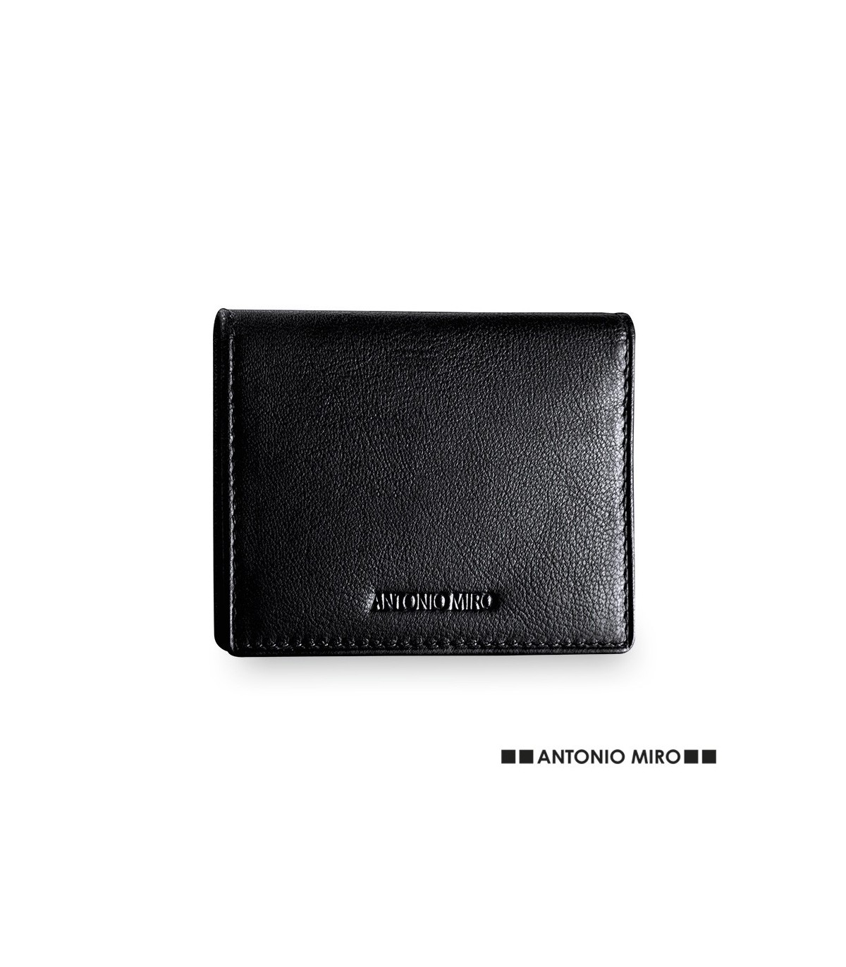 Tarjetero cartera de Antonio Miró con suave cuerpo acabado en piel de sobrios colores. Con 8 compartimentos para tarjetas y presentado en elegante estuche individual con logotipo de la marca.