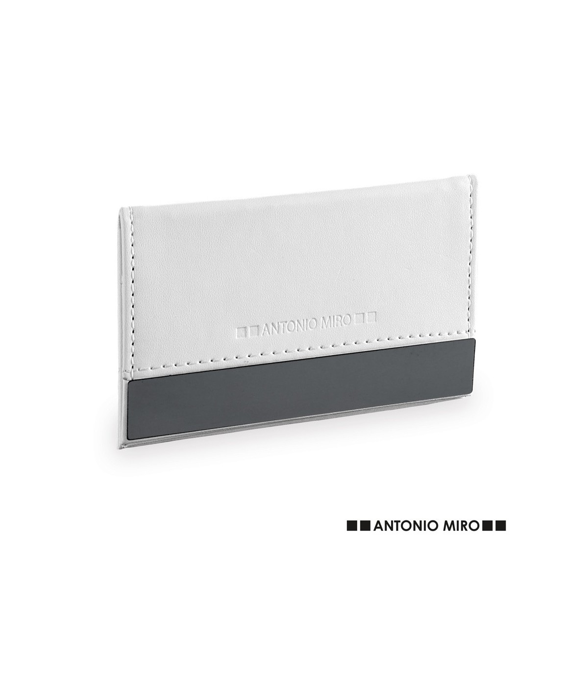 Tarjeteros con espejo de Antonio Miró en suave polipiel de acabado en color blanco, con chapa exterior metálica para personalizar y regalar como artículos publicitarios de empresa.