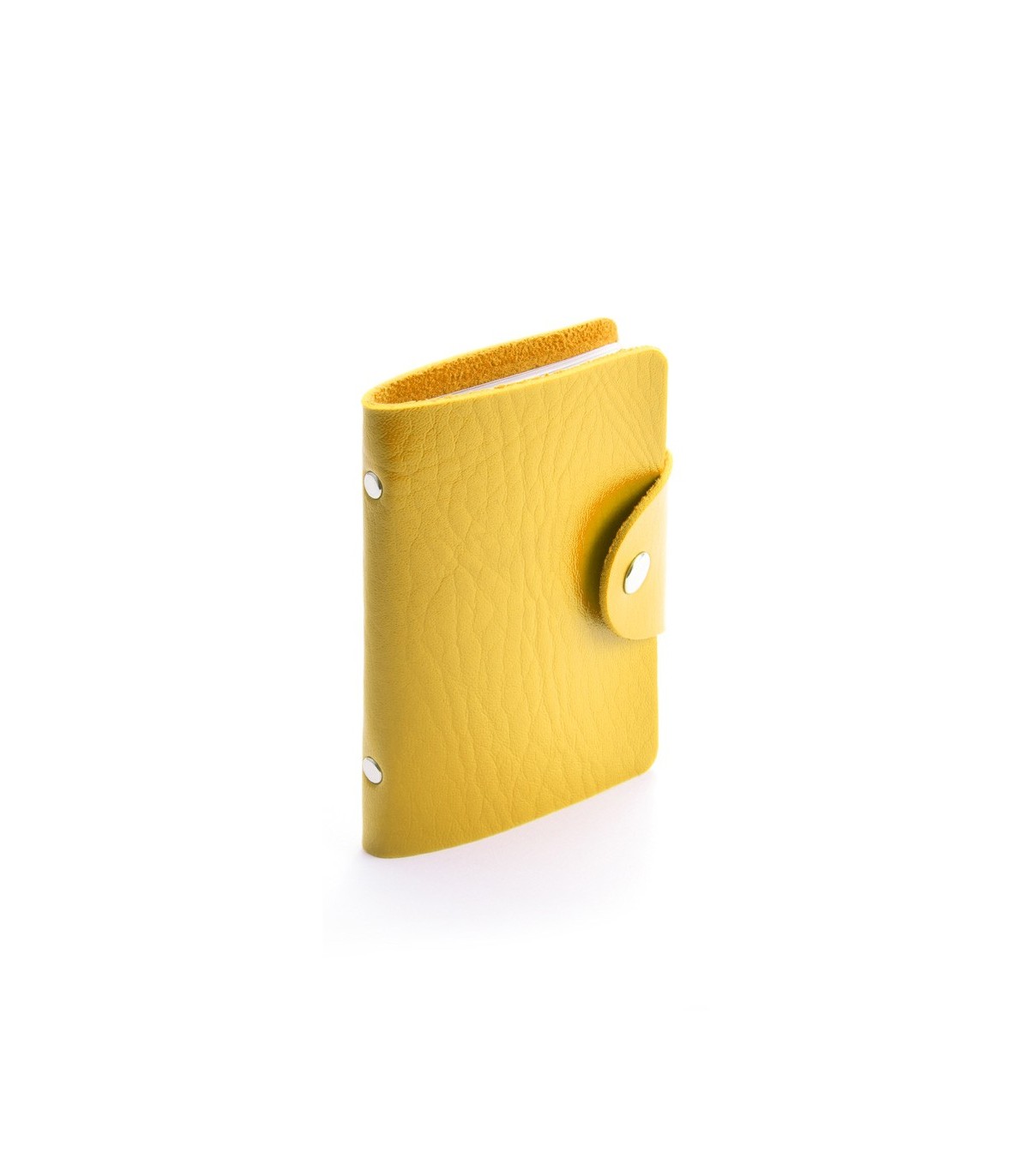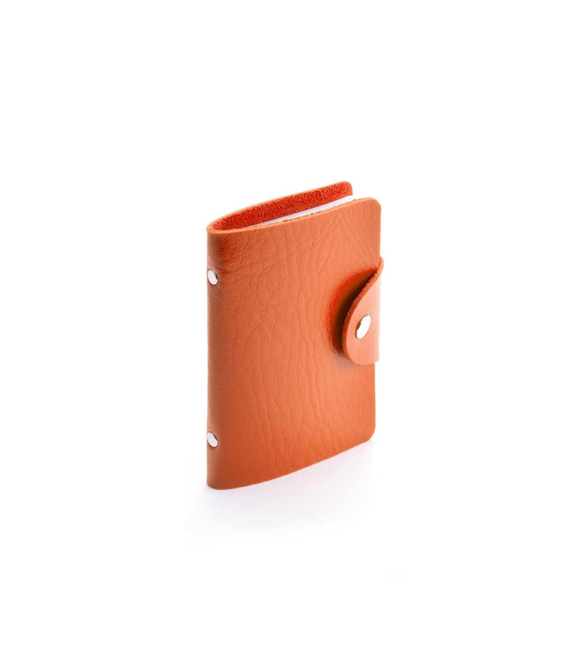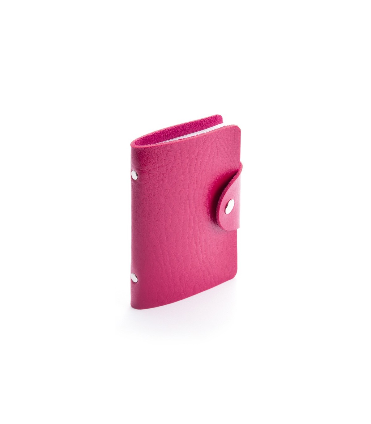 Tarjetero con cuerpo en suave acabado en polipiel de llamativos colores y cierre de corchete metálico. Con tachuelas de refuerzo metálicas en el lomo y 10 compartimentos interiores en resistente PVC transparente.