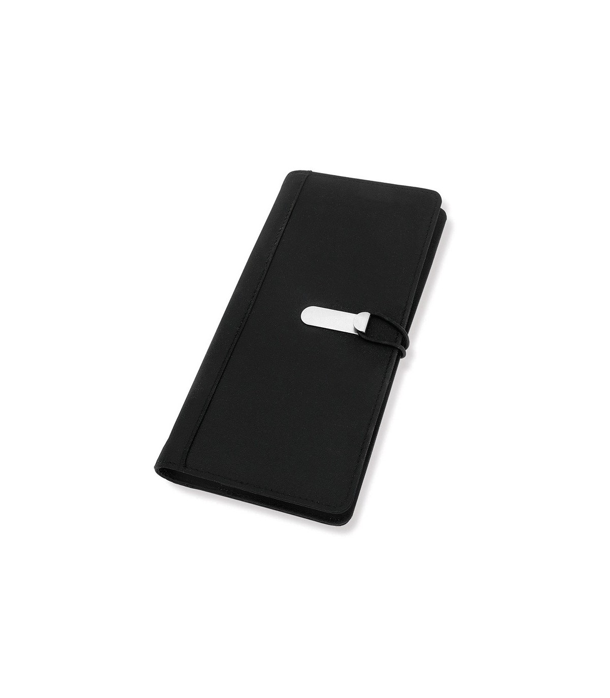 Elegante tarjetero de suave microfibra con cierre metálico de elástico especialmente diseñado para marcaje en láser. Con capacidad para 72 tarjetas distribuidas en fundas de resistente PVC transparente.