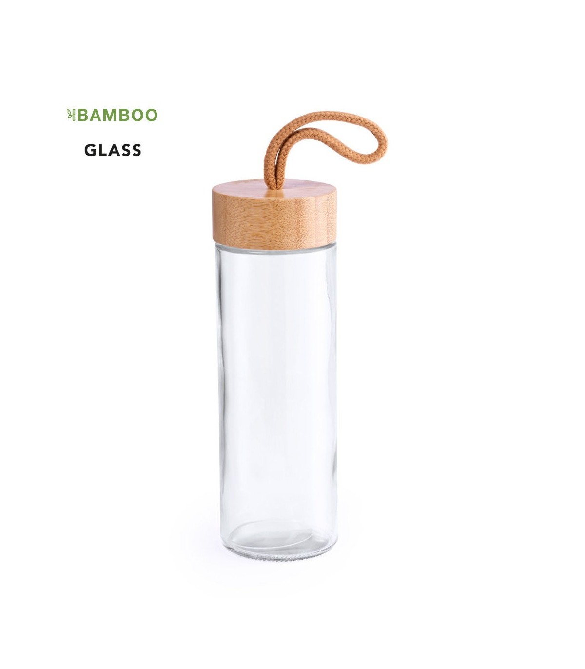 Elegante tarro de 420ml de capacidad. Fabricado con cuerpo de cristal y tapón a rosca de bambú, con práctica asa de transporte trenzada en color natural.