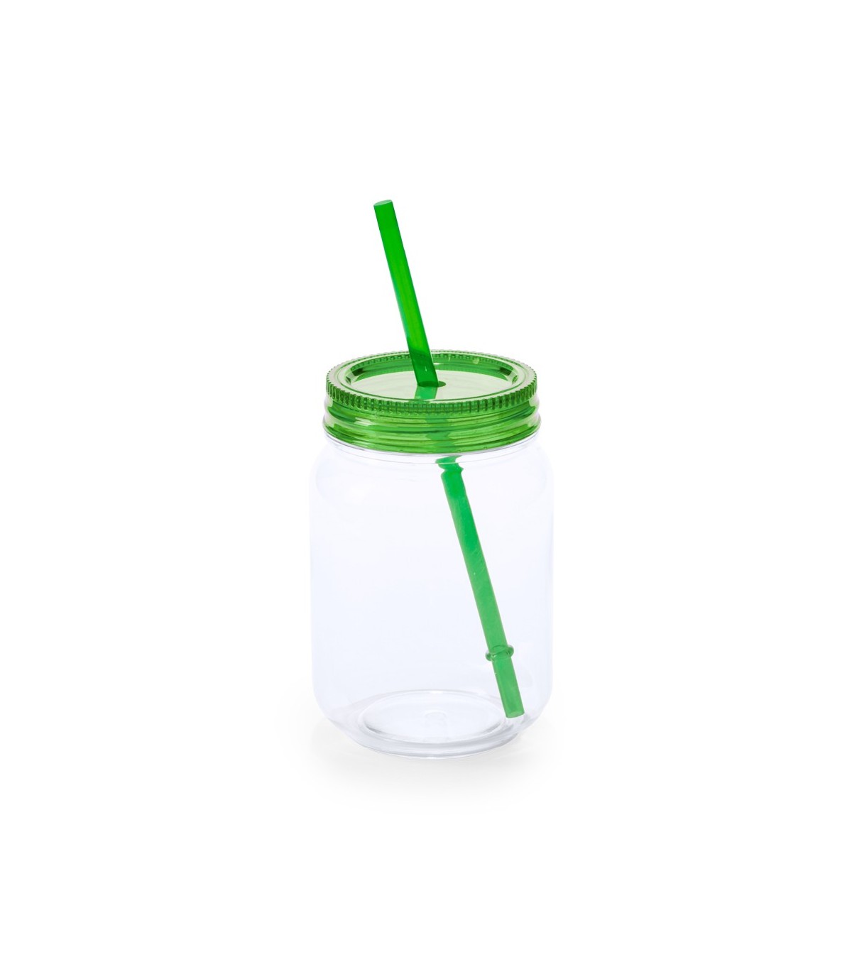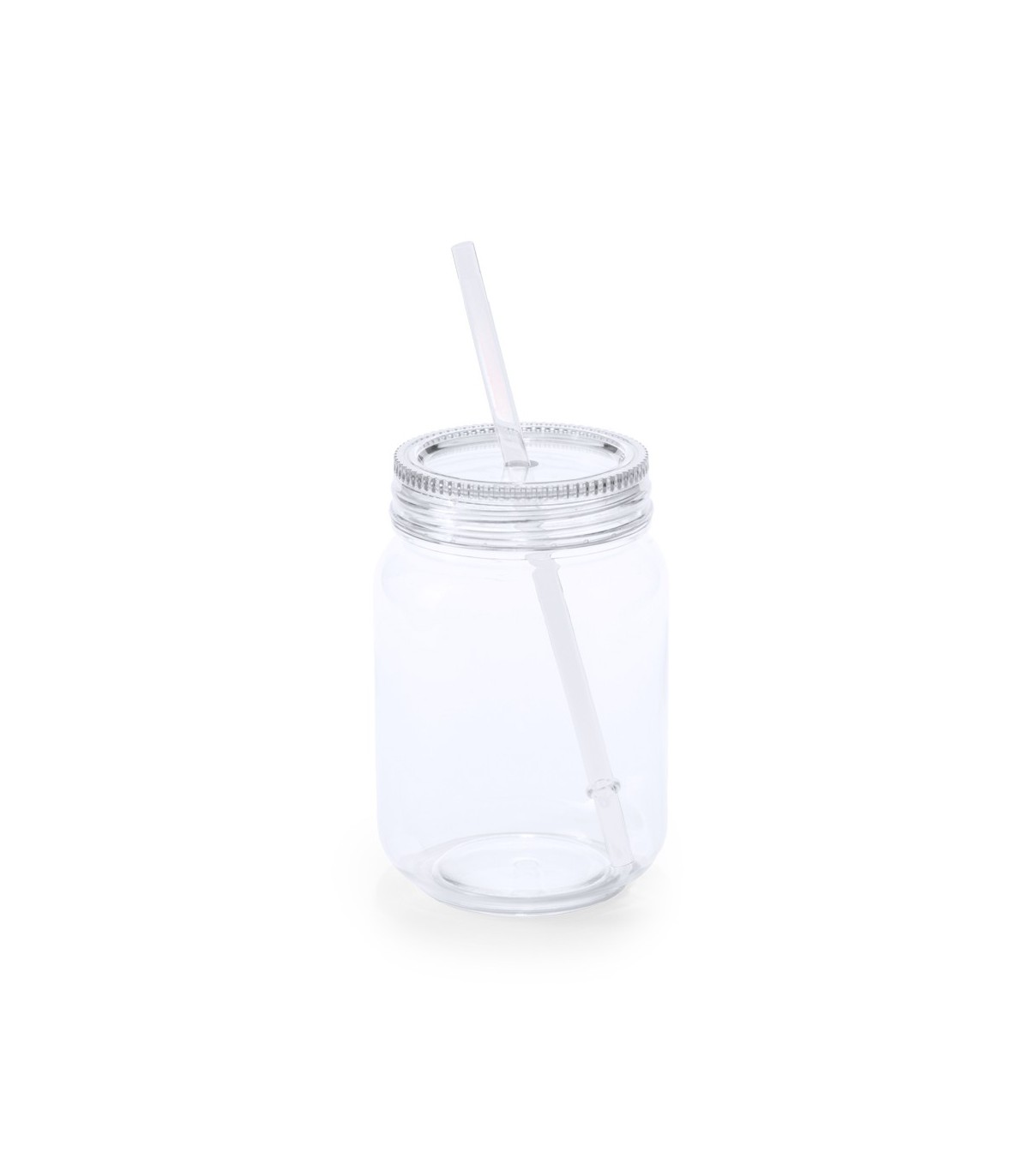 Divertido tarro de Polietileno de 600ml de capacidad con cuerpo en transparente, con tapa a rosca y pajita a juego promocionales para regalos de empresa con logo.