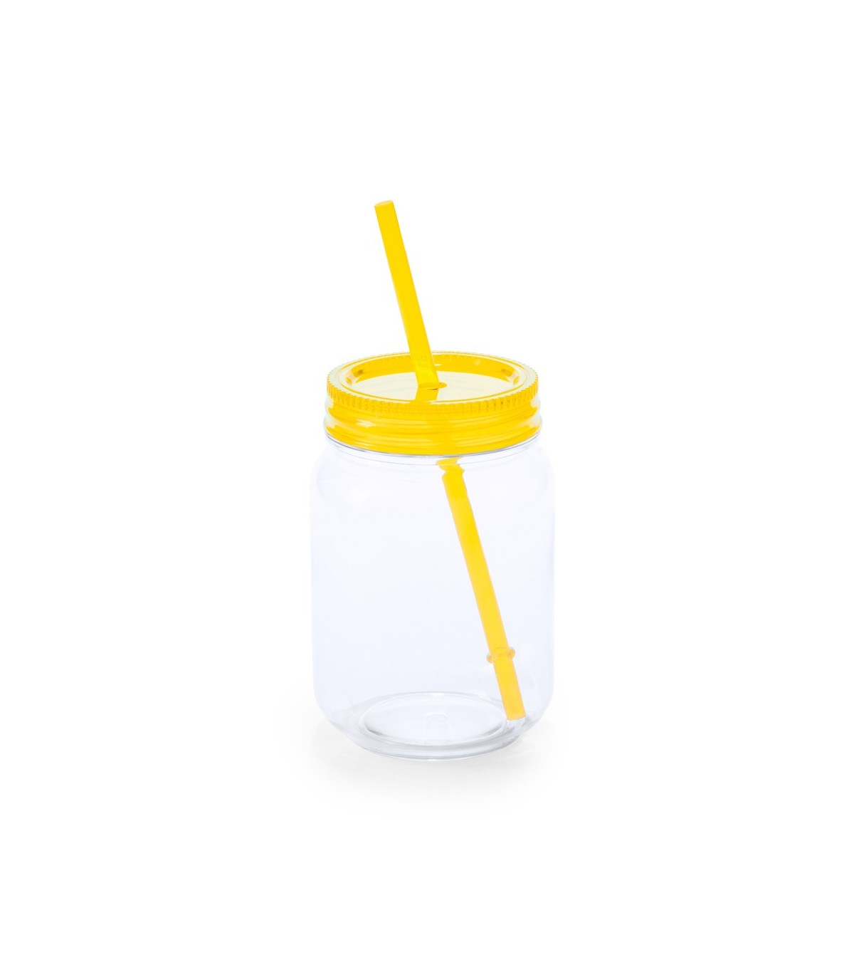 Divertido tarro de PS de 600ml de capacidad con cuerpo en transparente y accesorios en variada gama de vivos colores. Con tapa a rosca y pajita a juego.