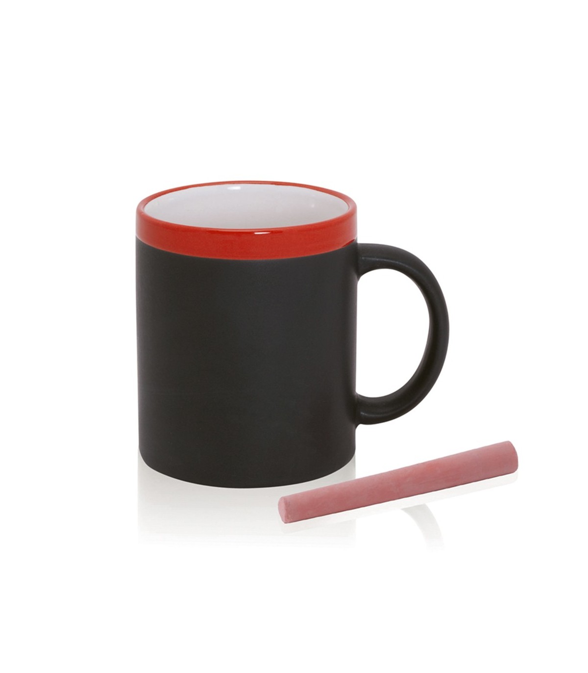 Taza de cerámica de 350ml de capacidad con cuerpo negro pizarra para pintar y boca en divertida gama de vivos colores. Tiza incluida a juego y Presentación en embalaje individual.