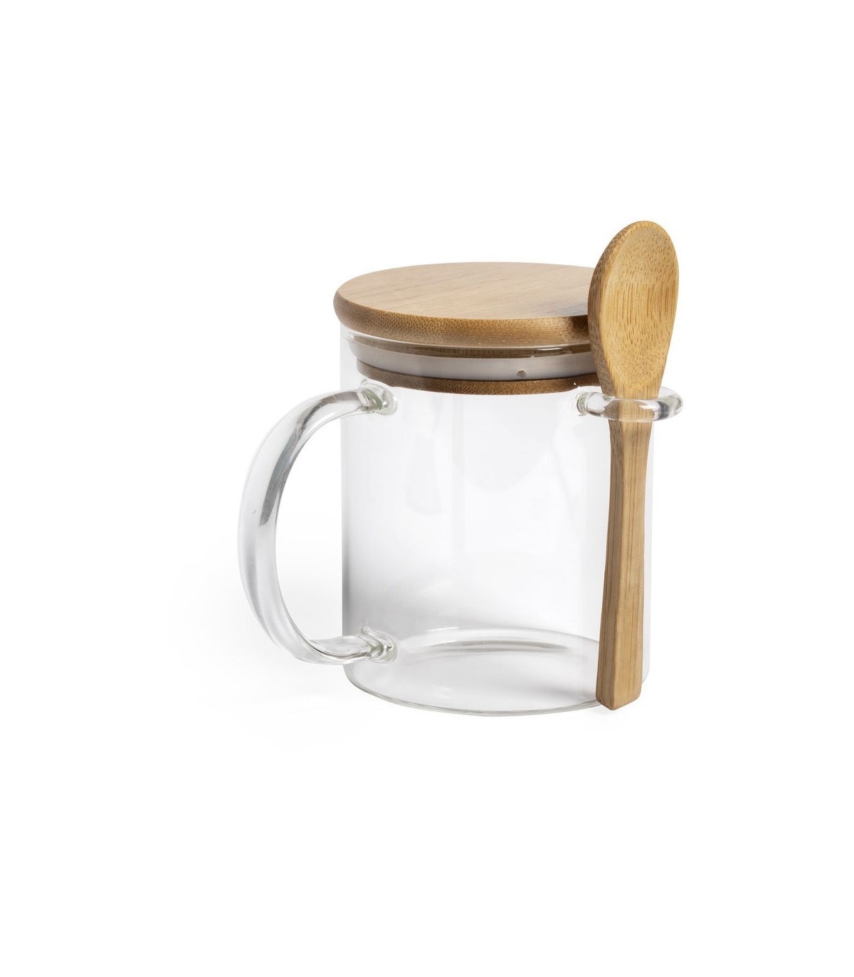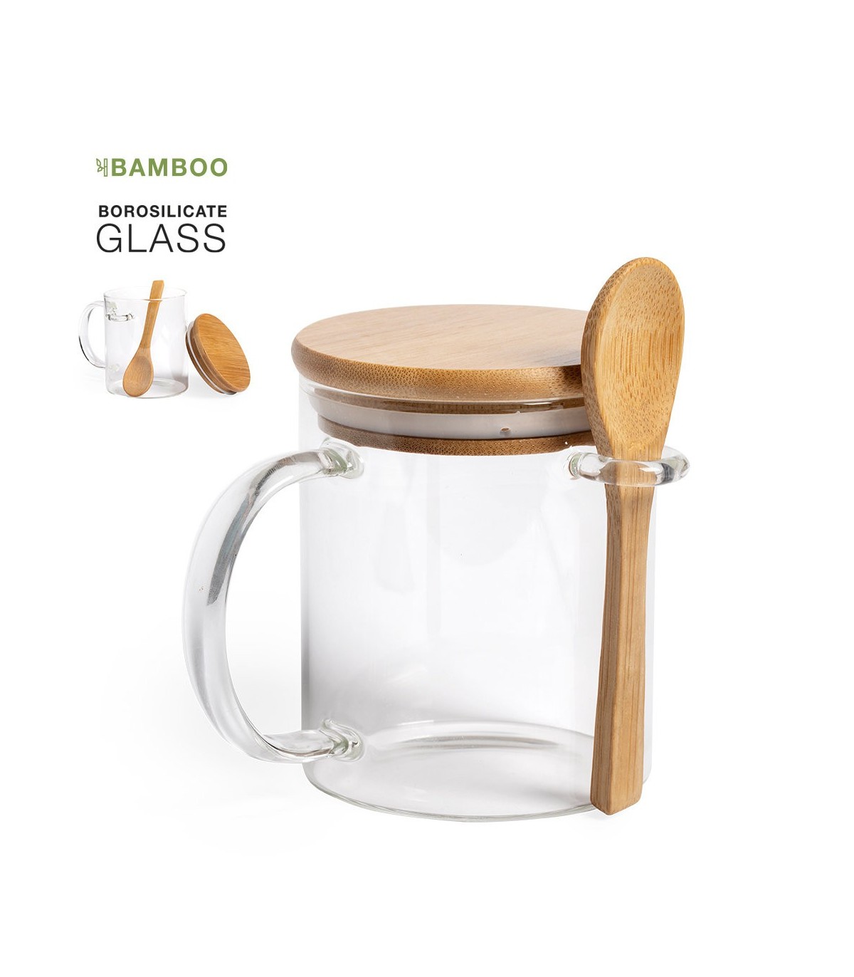 Tazas hechas en cristal de borosilicato, que ofrece una resistencia y durabilidad excepcionales, alargando su vida útil. Con tapa y cuchara de bambú pulido.