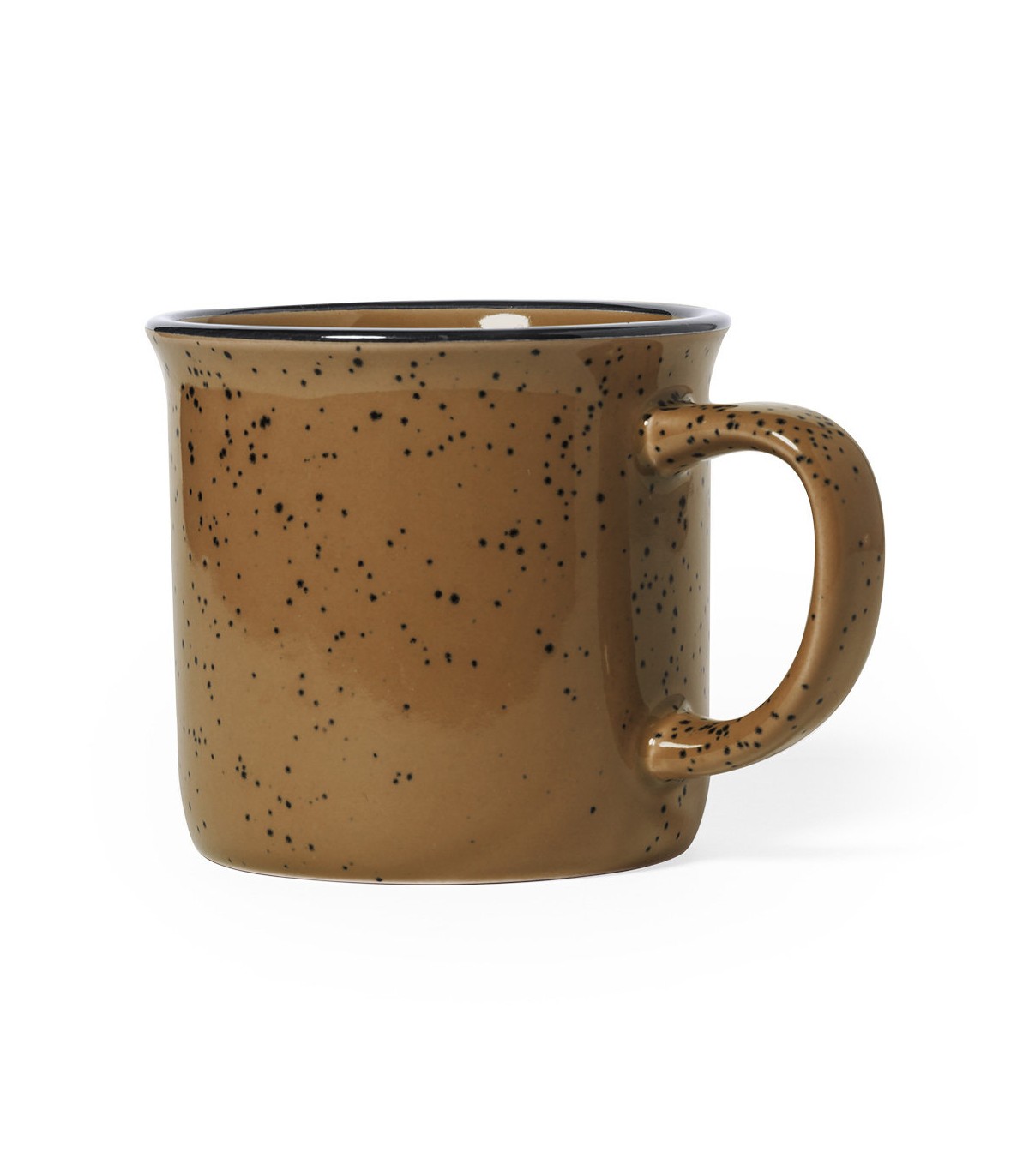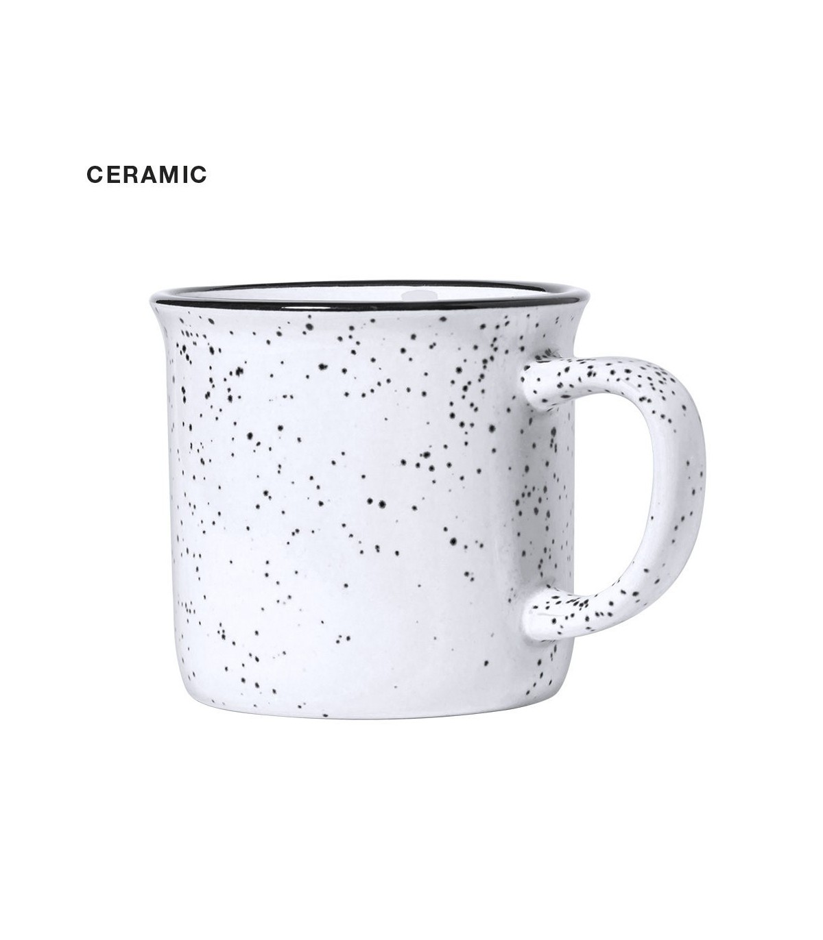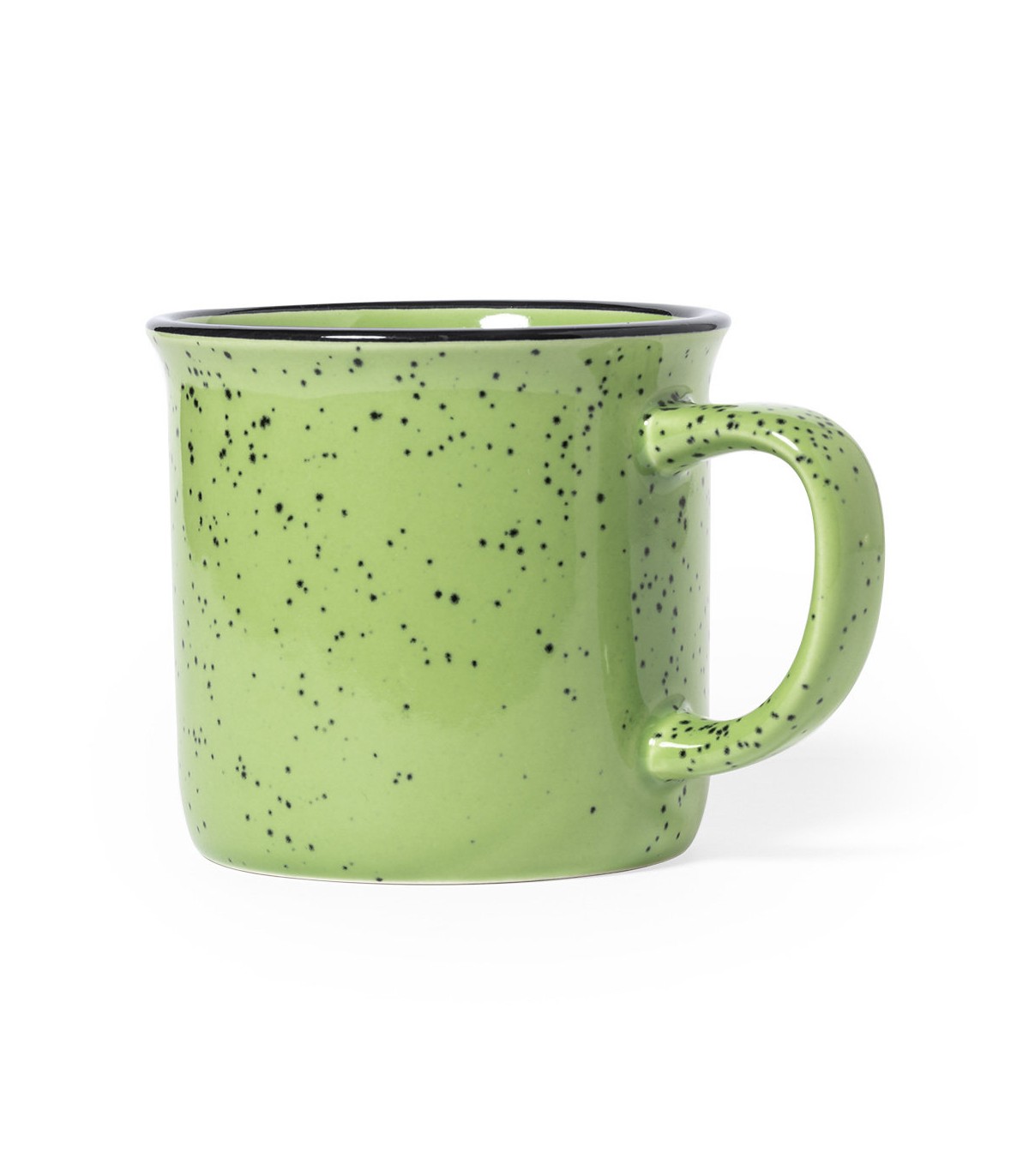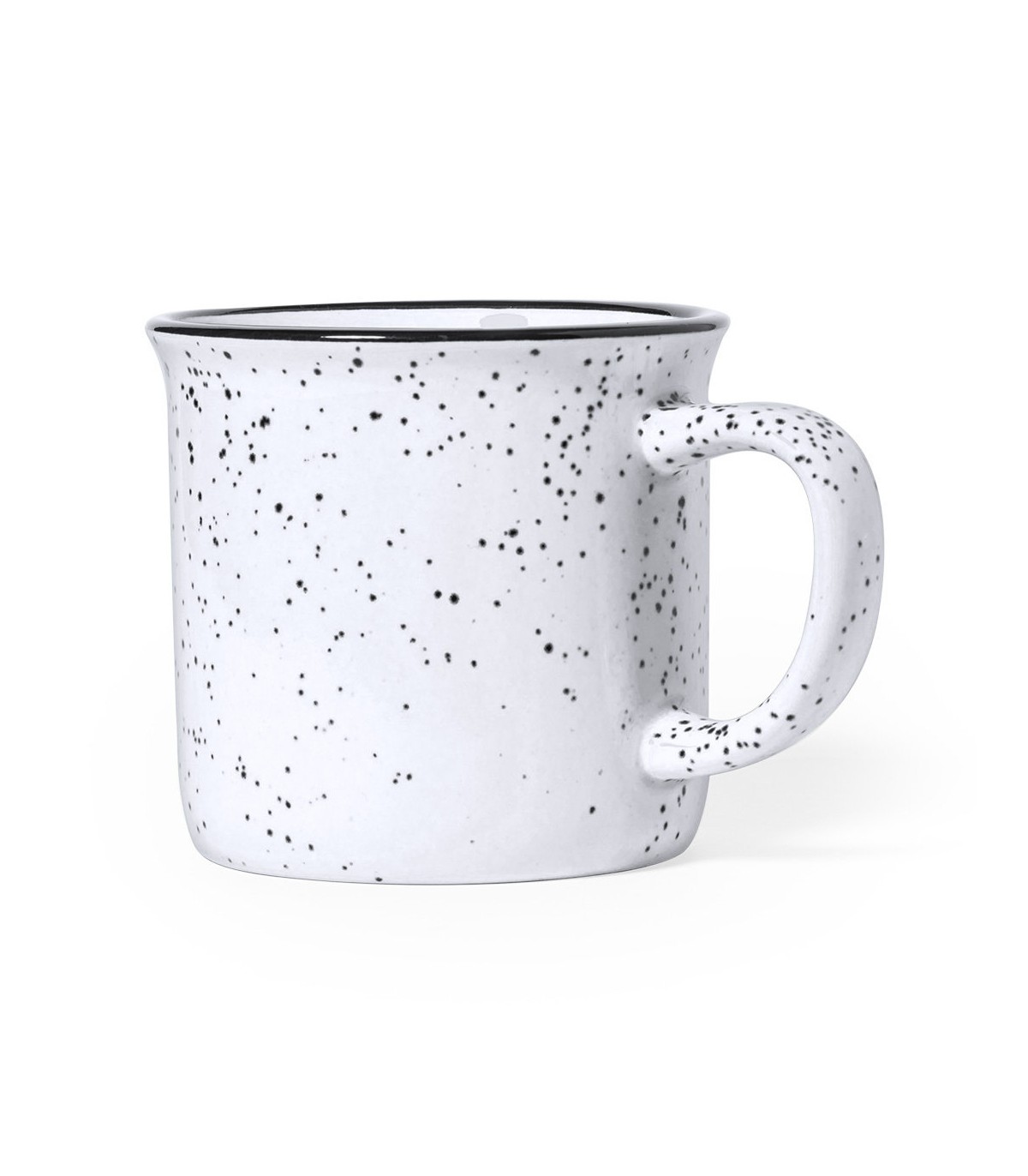 Tazas de cerámica de 350ml de capacidad con diseño vintage. En combinación de exterior en colores moteados e interior a juego, con borde negro. Presentada en caja individual acabado kraft.