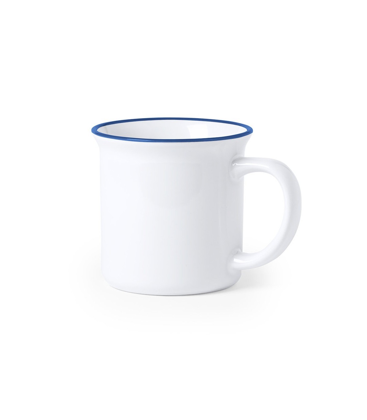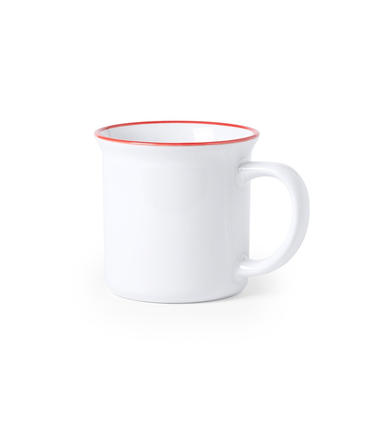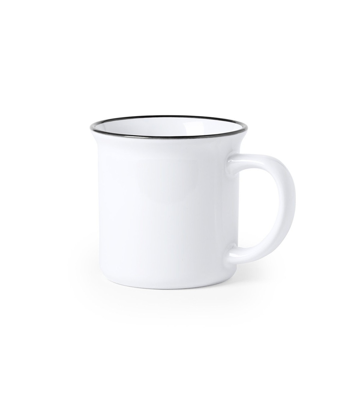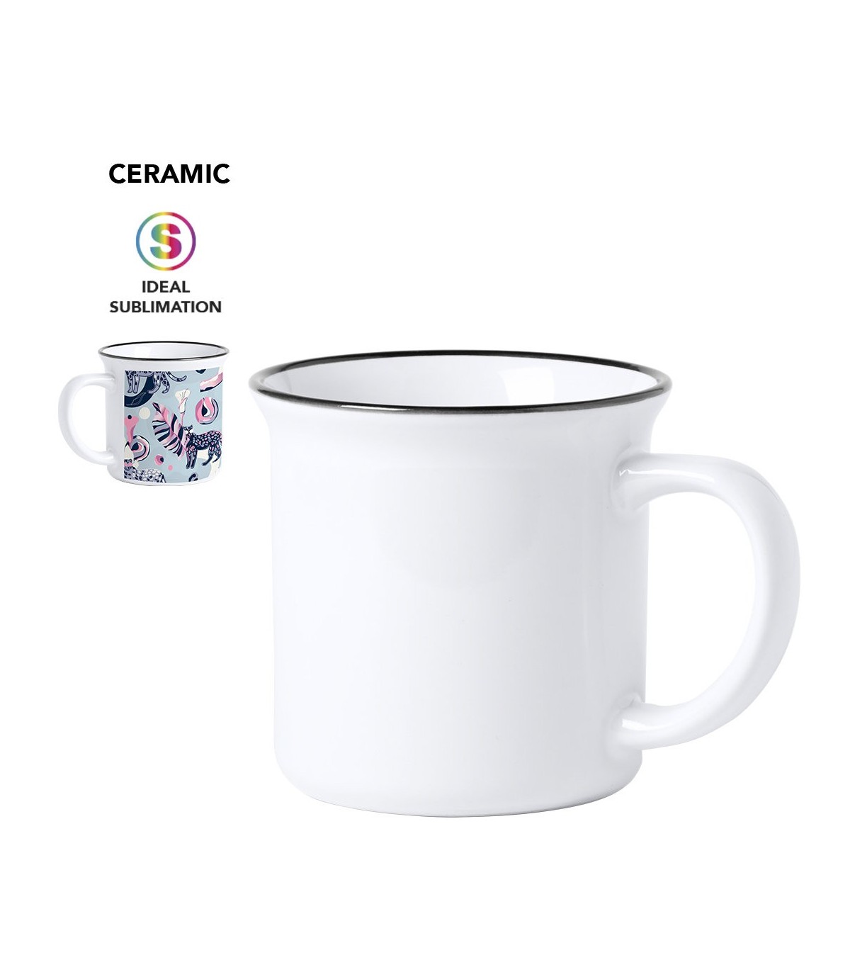 Taza de cerámica de 300ml de capacidad con diseño vintage. En elegante diseño bicolor, con anilla coloreada en el borde y cuerpo en color blanco. Especialmente diseñada para marcaje en sublimación. Presentación en embalaje individual.
