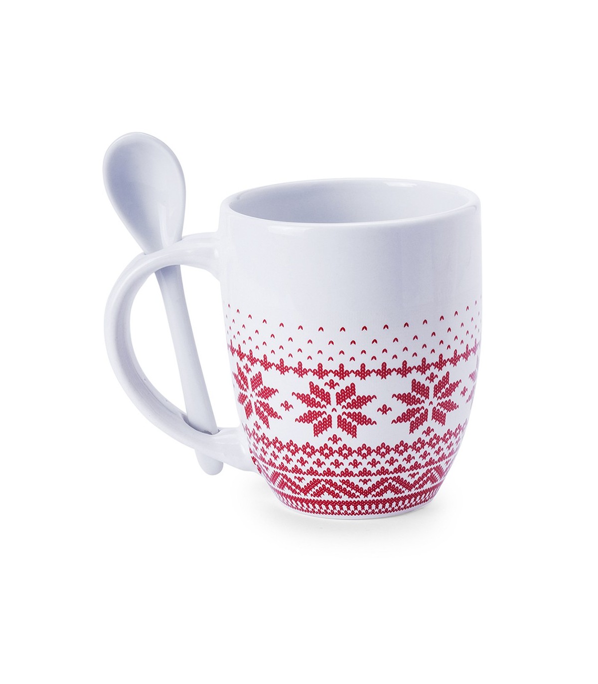 Taza de cerámica de 370ml exterior e interior en color blanco con diseños invernales y cuchara de cerámica a juego integrada en asa para regalos de empresa.