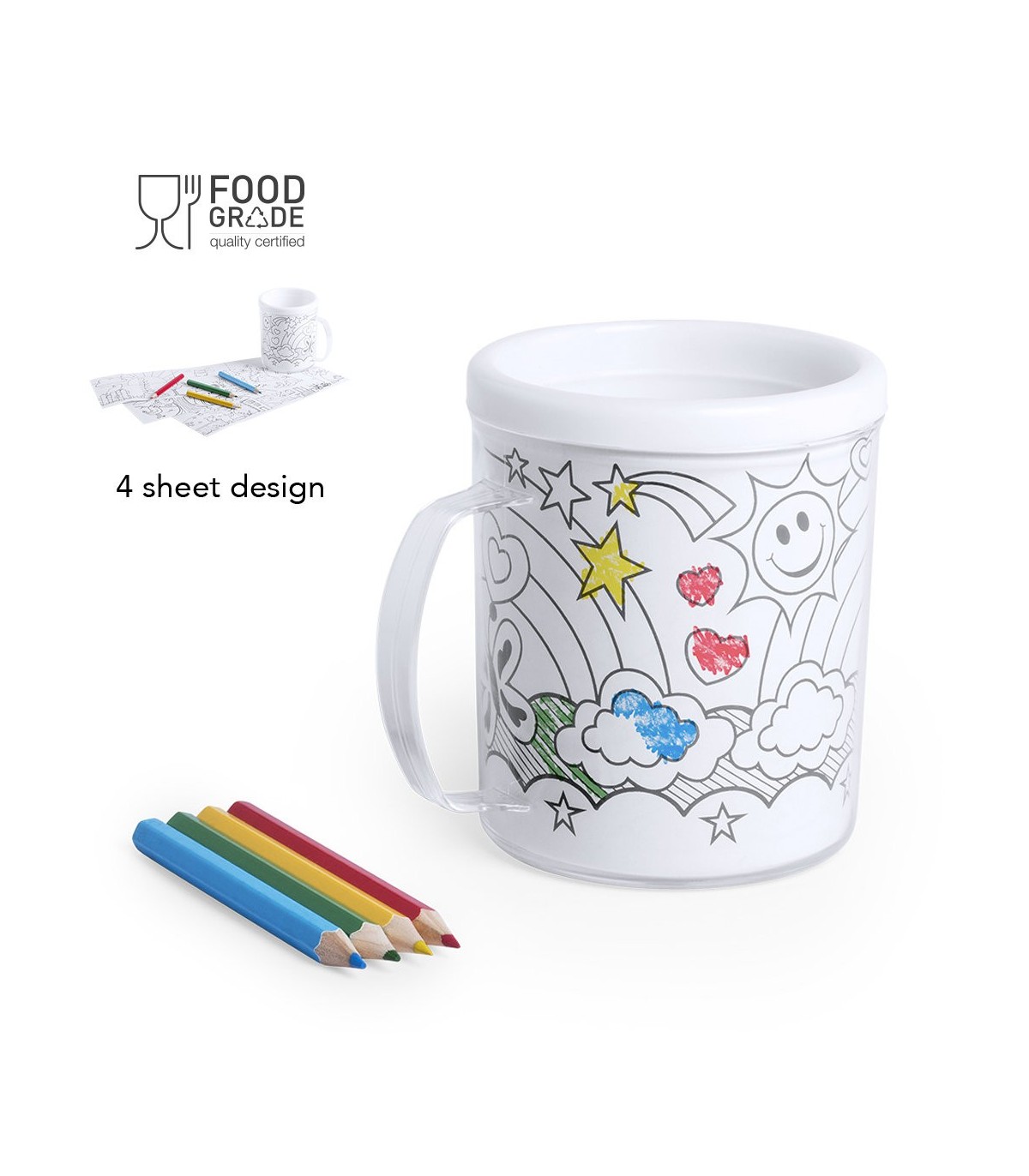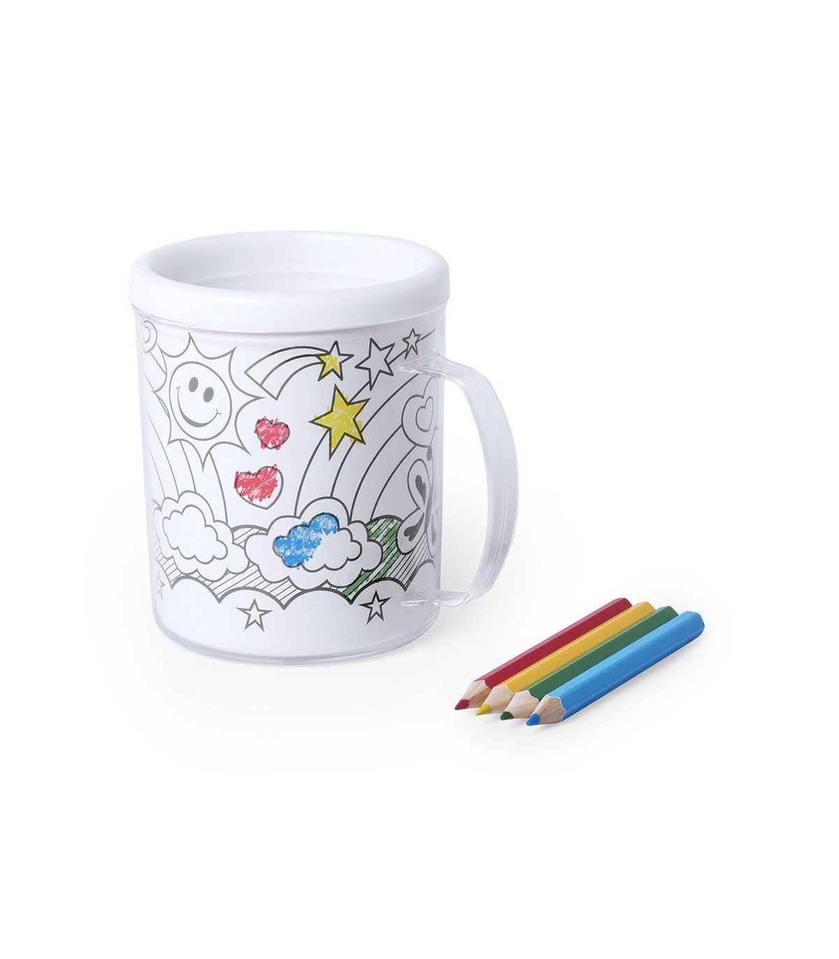 Taza para colorear de 320ml de capacidad. Carcasa exterior de la taza con cubierta transparente extraíble para insertar la lámina coloreada y parte interior en PP de color blanco. Con 4 láminas para pintar y 4 lápices de colores. Presentacion en embaleje individual.