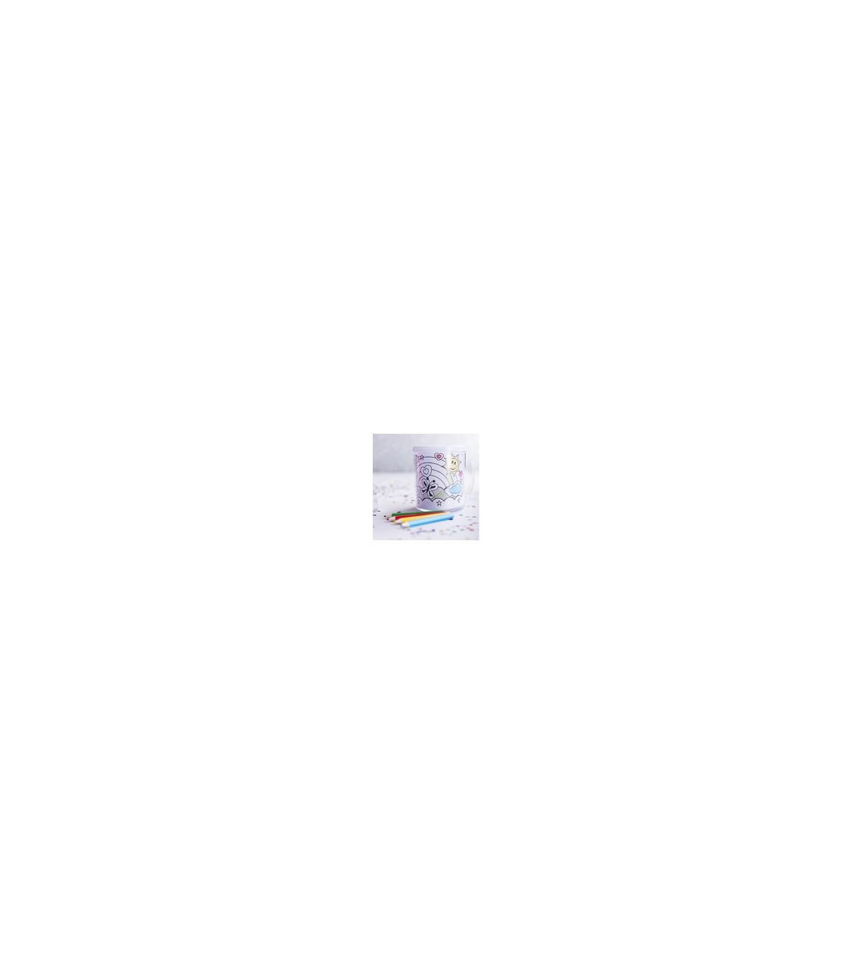 Taza de 320ml cubierta transparente extraíble para insertar la lámina coloreada y parte interior en PP Con 4 láminas para pintar y 4 lápices de colores.