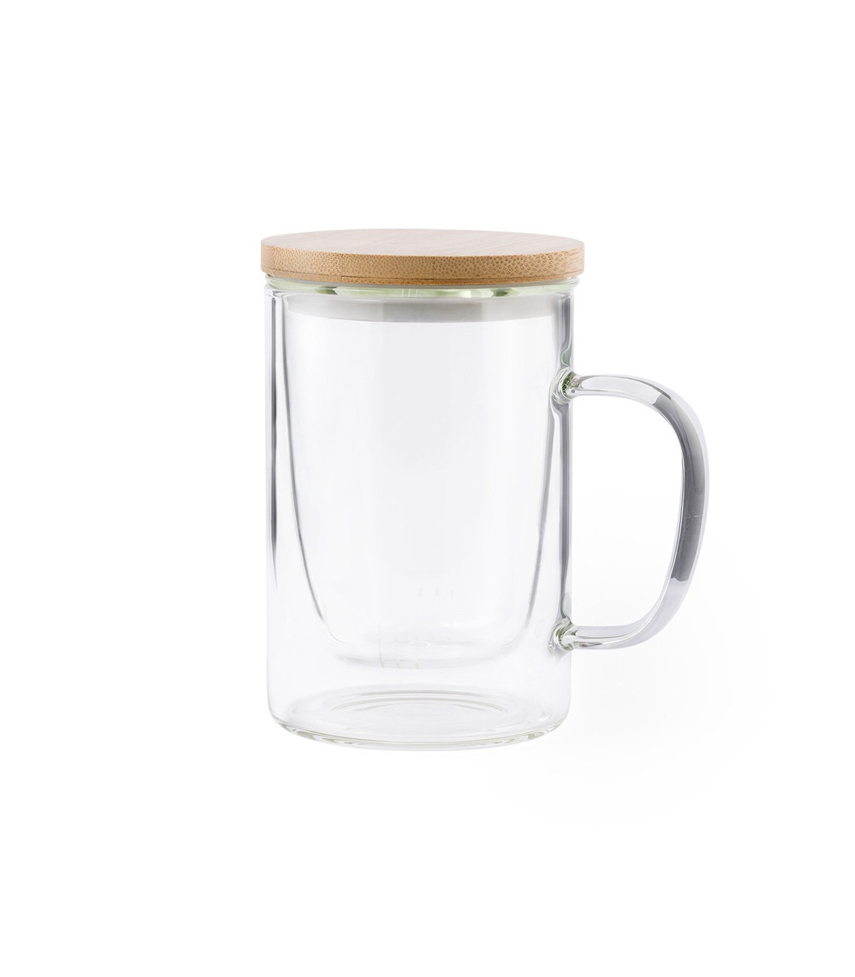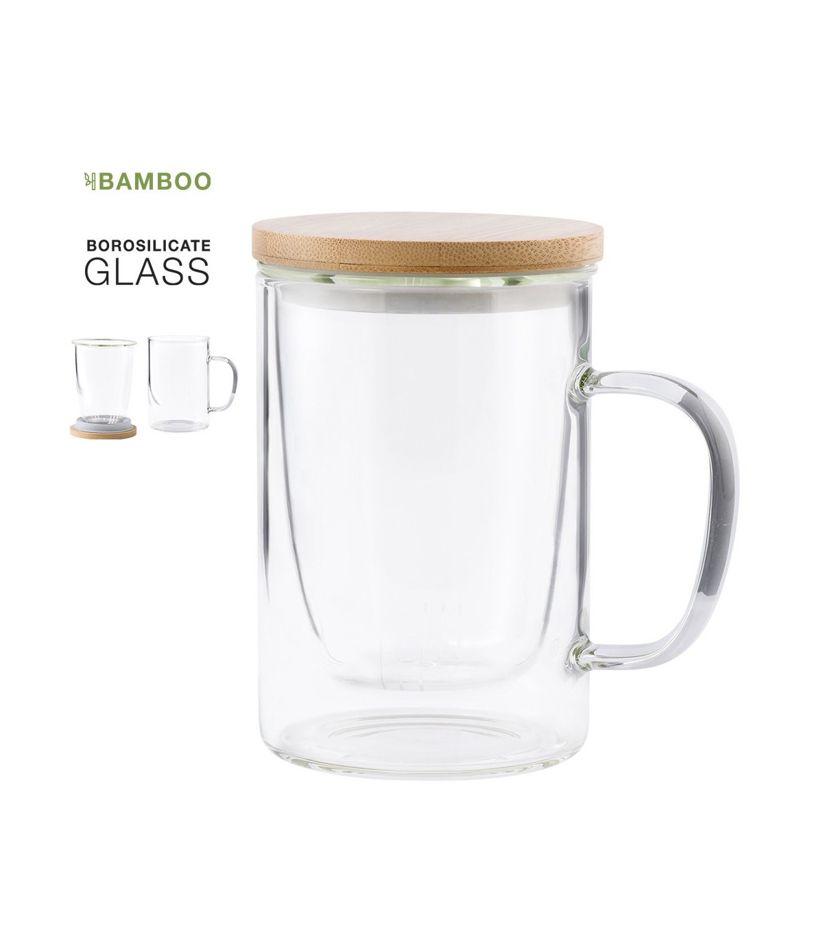 Tazas para infusiones con infusor incluido. En cristal de borosilicato y tapa en bambú libre de BPA y personalizados con tu logo de empresa