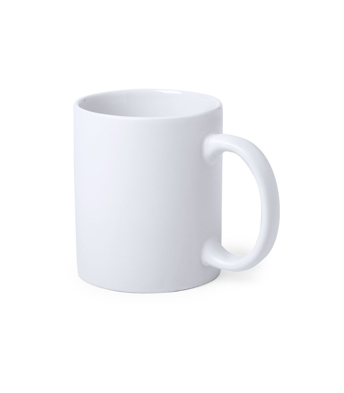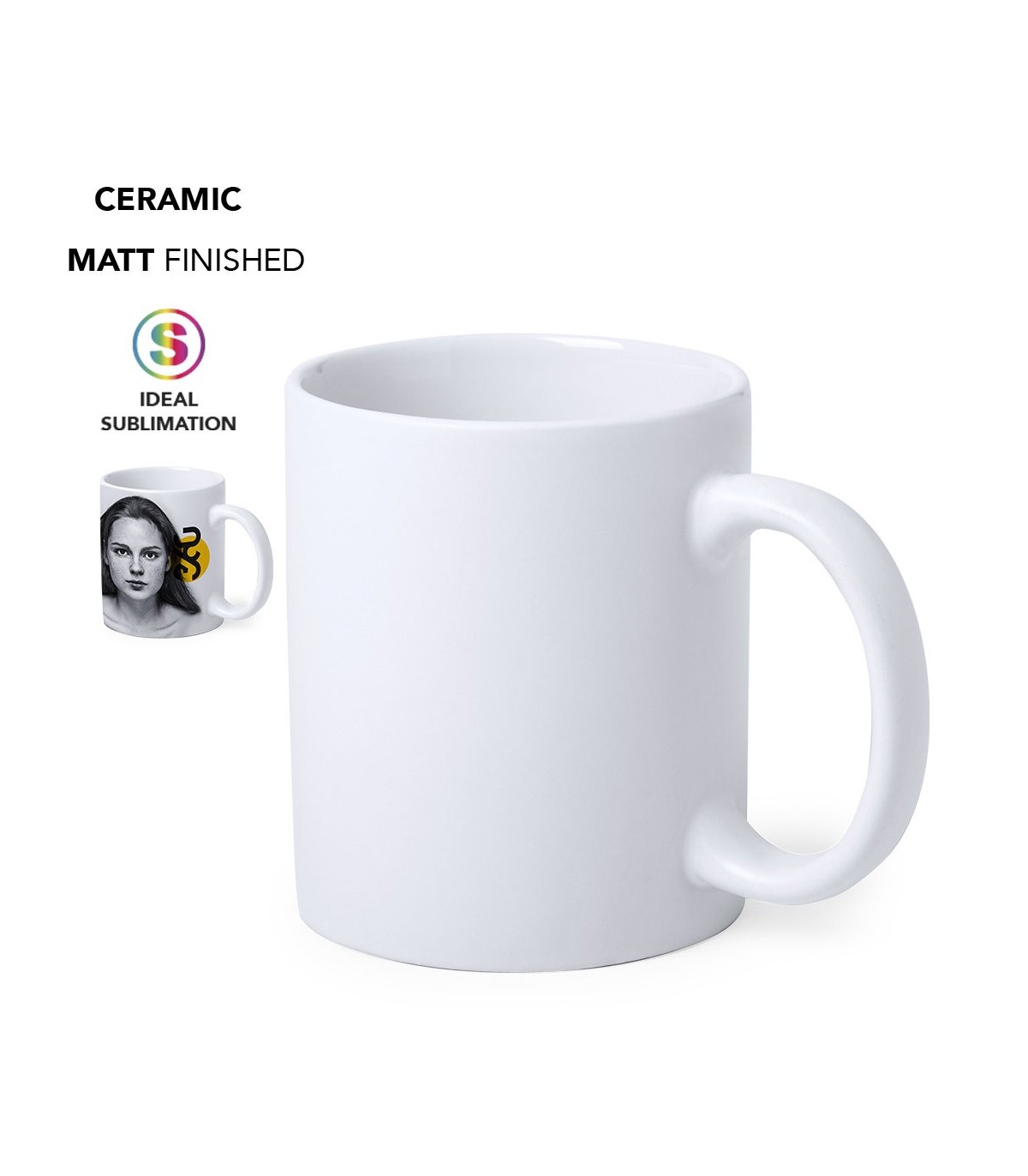 Taza de cerámica de 350ml de capacidad de acabado mate y especialmente diseñada para marcaje en sublimación. Presentación en embalaje individual.