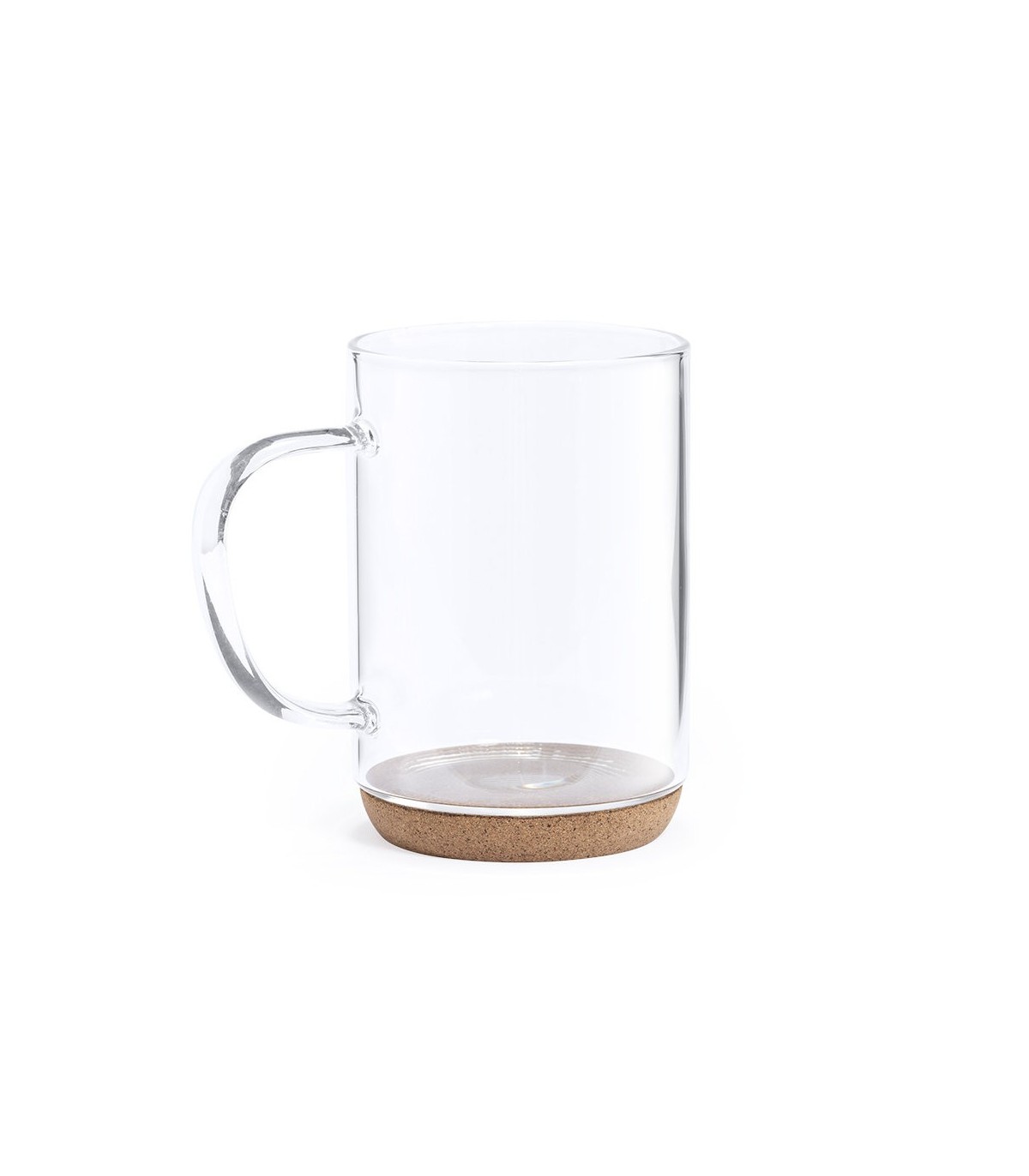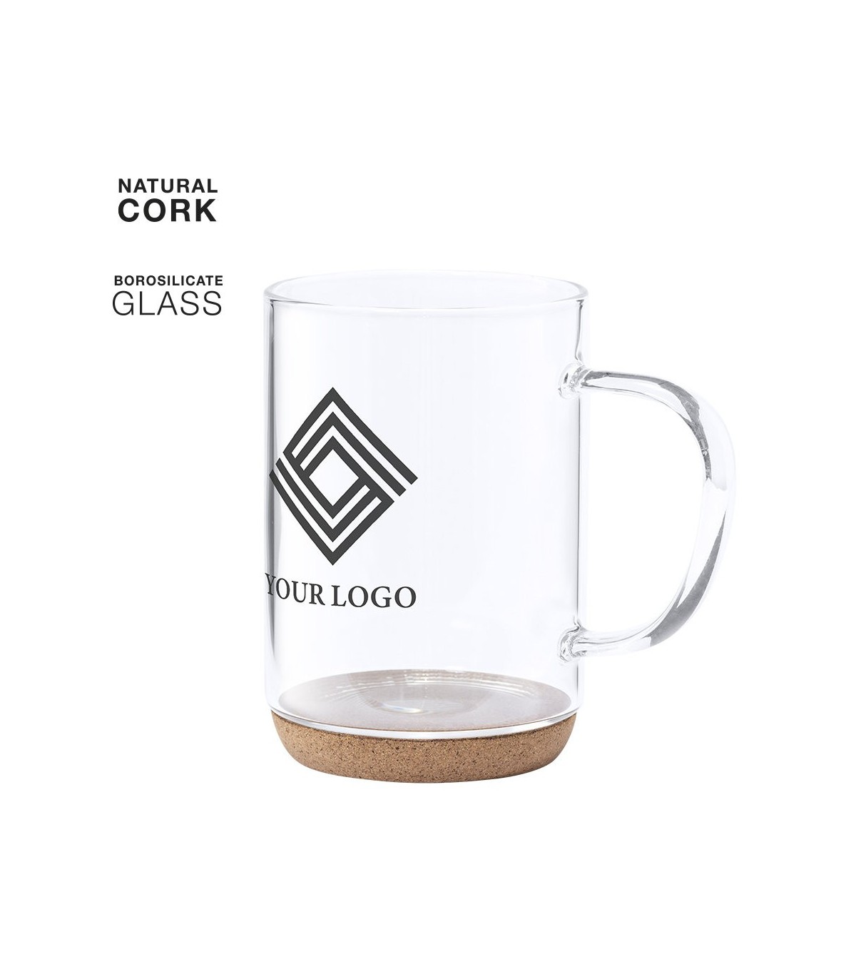 Tazas ecológicas de 450 ml de capacidad y base en corcho natural. Fabricada en cristal de borosilicato ideales para todo tipo de regalos promocionales.