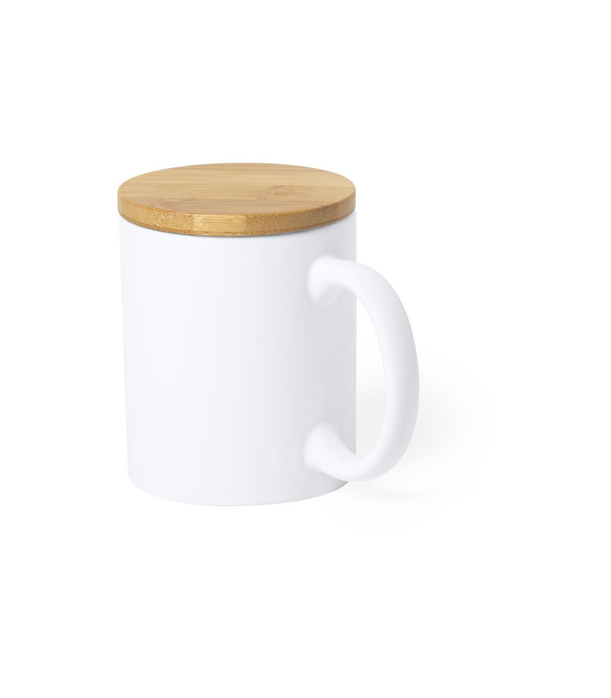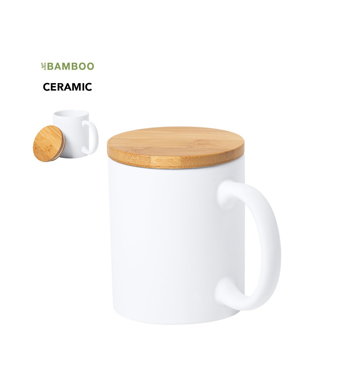 Taza de fabricación ecológica de 370 ml de capacidad. Fabricada en cerámica de acabado mate, con tapa de bambú pulido y Presentación en embalaje individual de diseño eco.