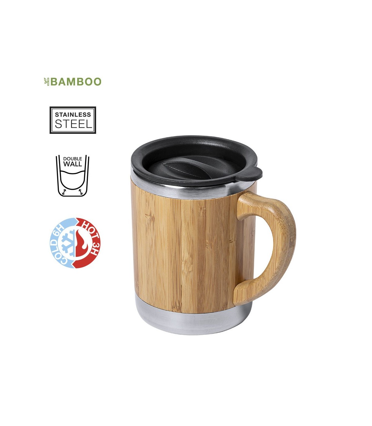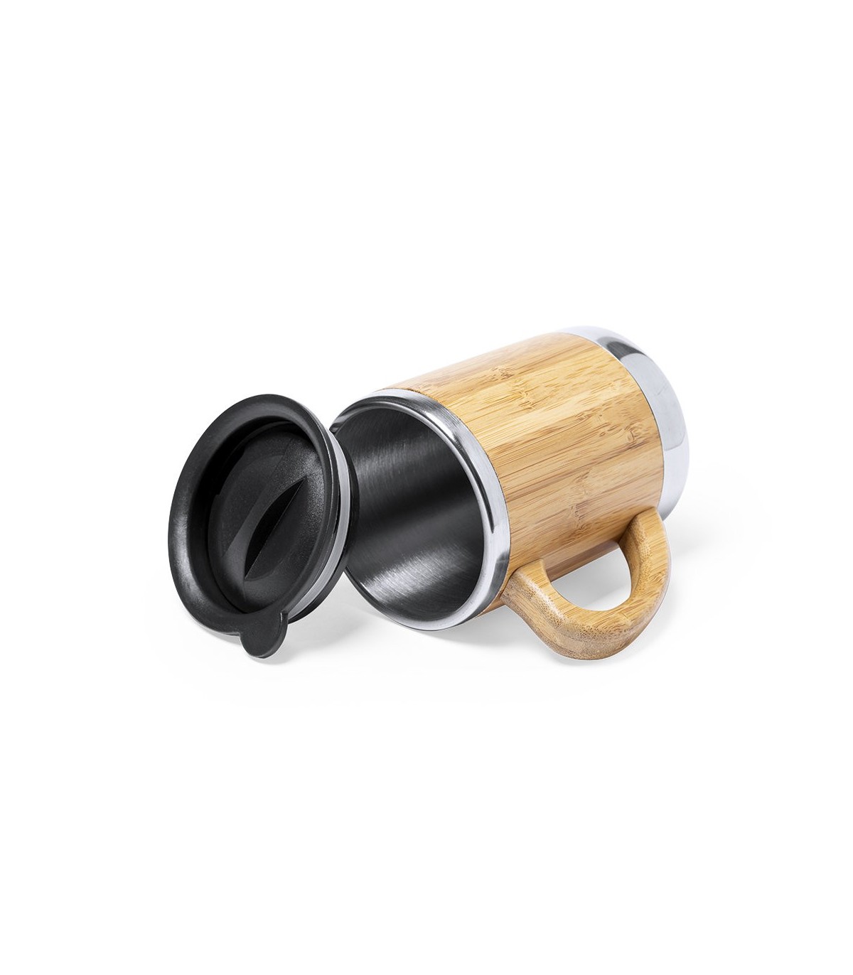 Tazas promocionales hechas en bambú y acero inox de doble pared para mejor y más duradera conservación de la temperatura. Con original tapón dosificador.