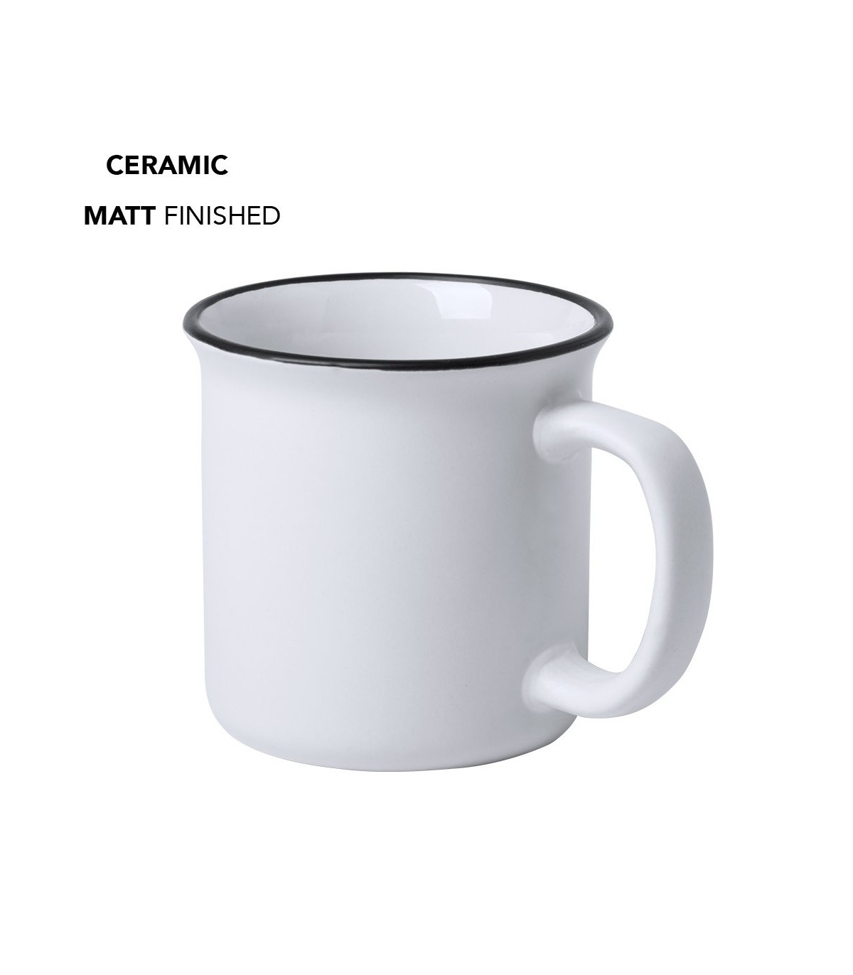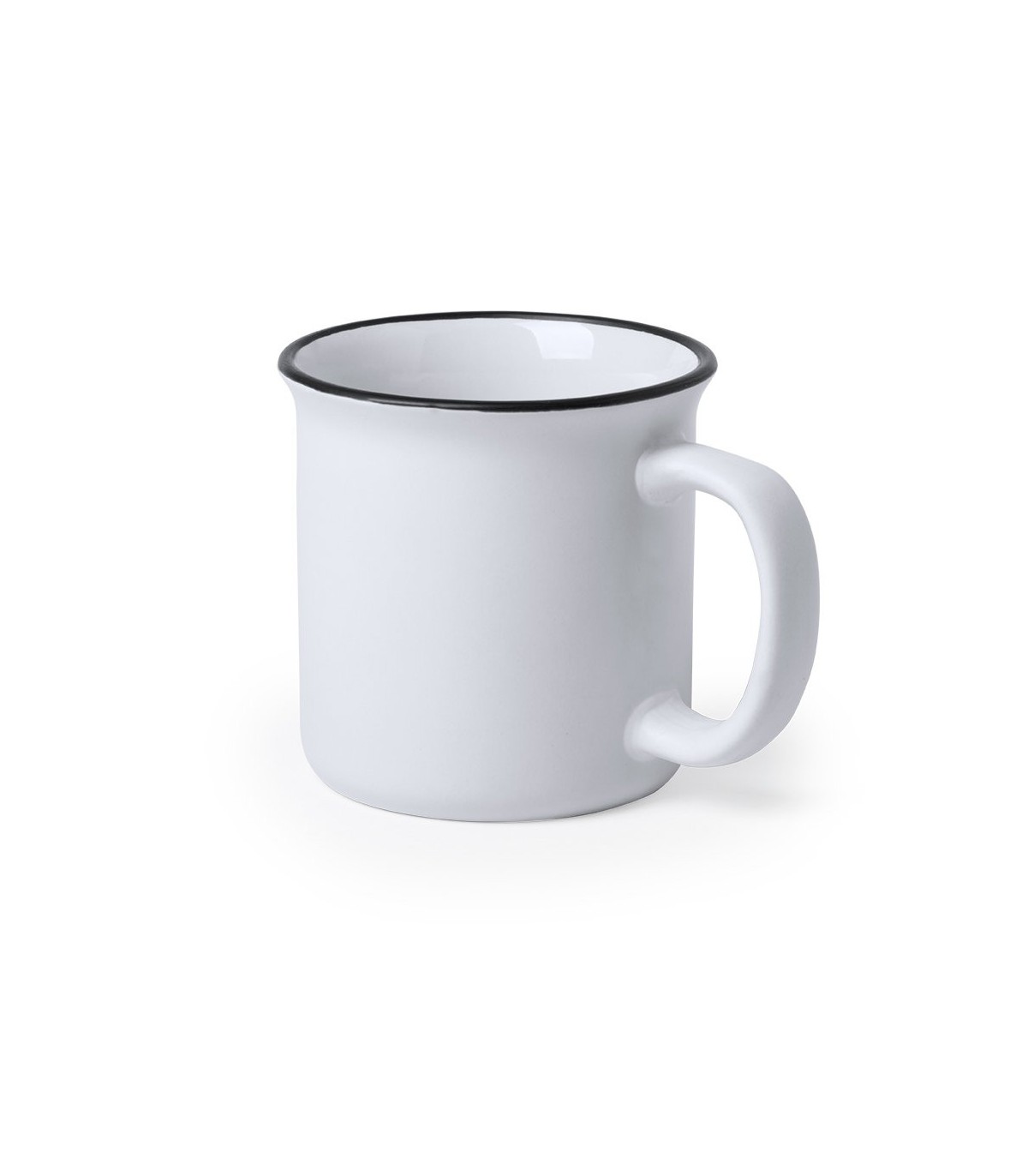 Taza de cerámica de 300ml de capacidad con diseño vintage. En sobrio diseño bicolor, con anilla en el borde. Presentación en embalaje individual.