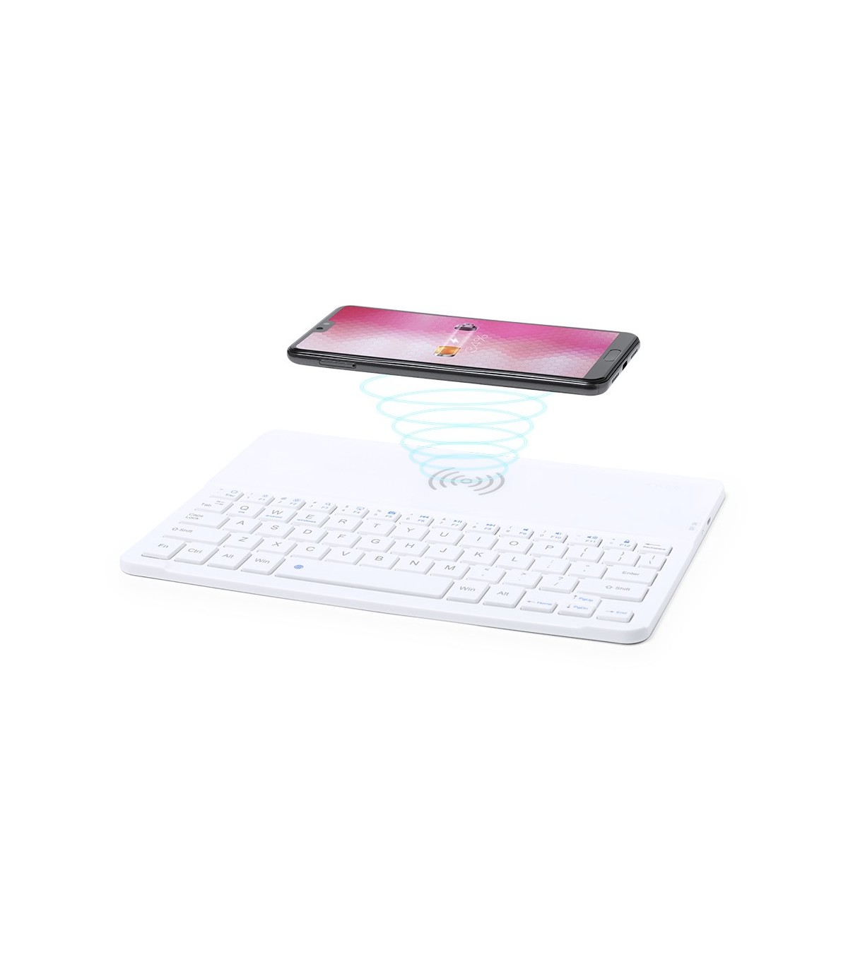 Teclado de conexión bluetooth con cargador inalámbrico integrado y soporte para dispositivo móvil, recargable mediante USB -cable incluido-.