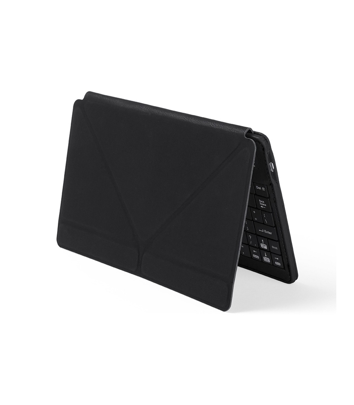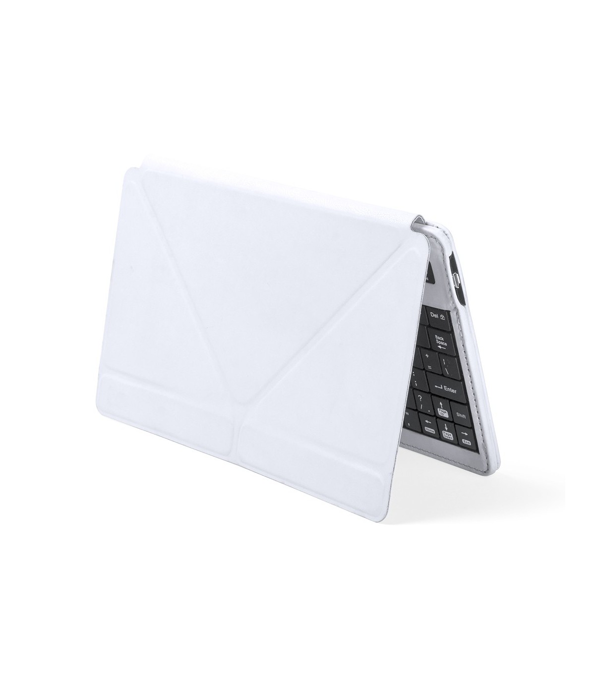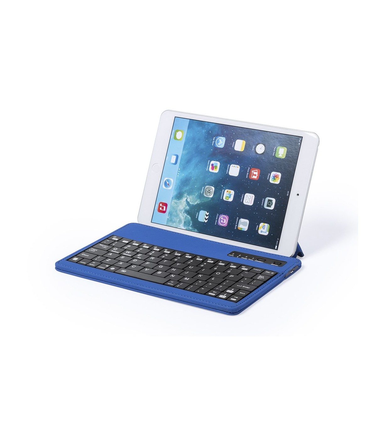 Teclado soporte fabricado en polipiel con conexión mediante bluetooth recargable personalizados como articulo promocional.