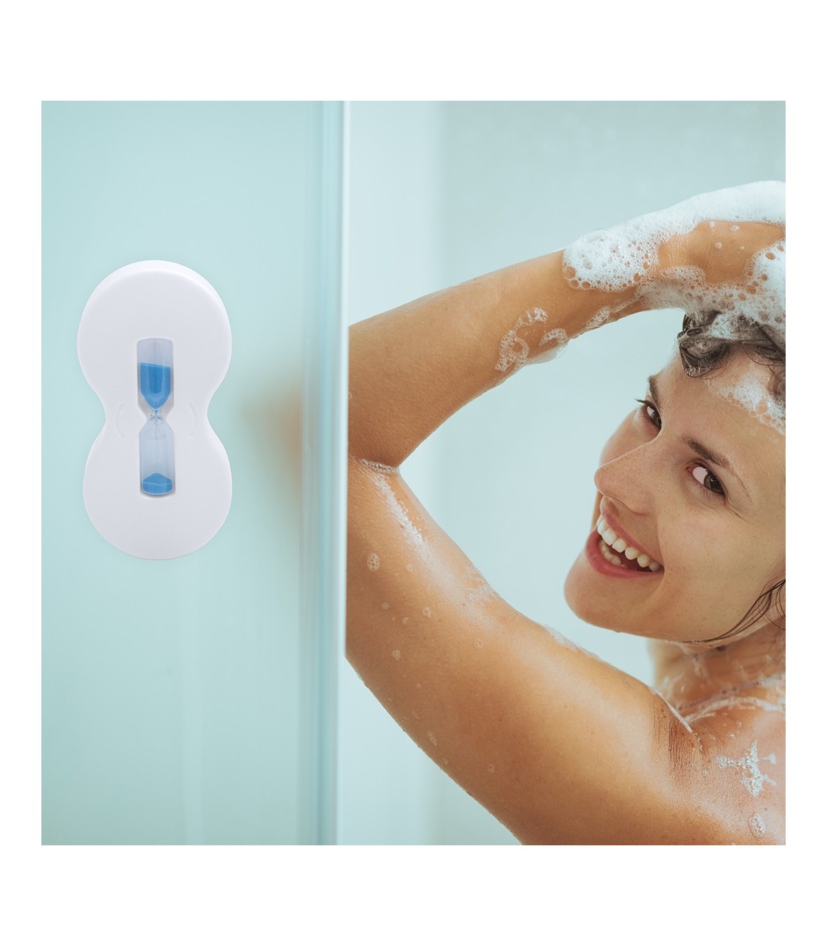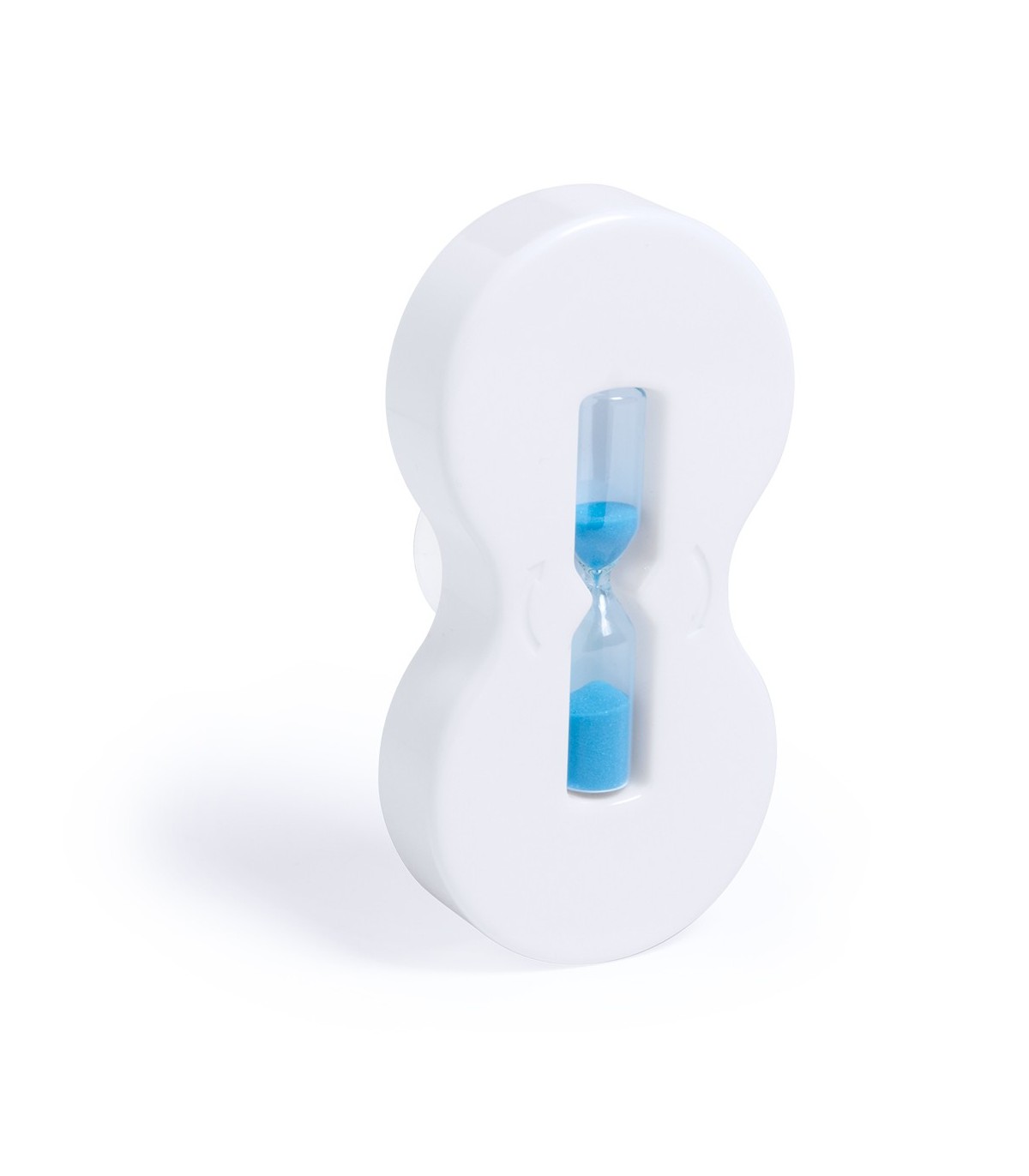 Temporizador/reloj de arena de 5 minutos. De diseño minimalista en color blanco y arena azul, con ventosa en PVC de alto poder de fijación.