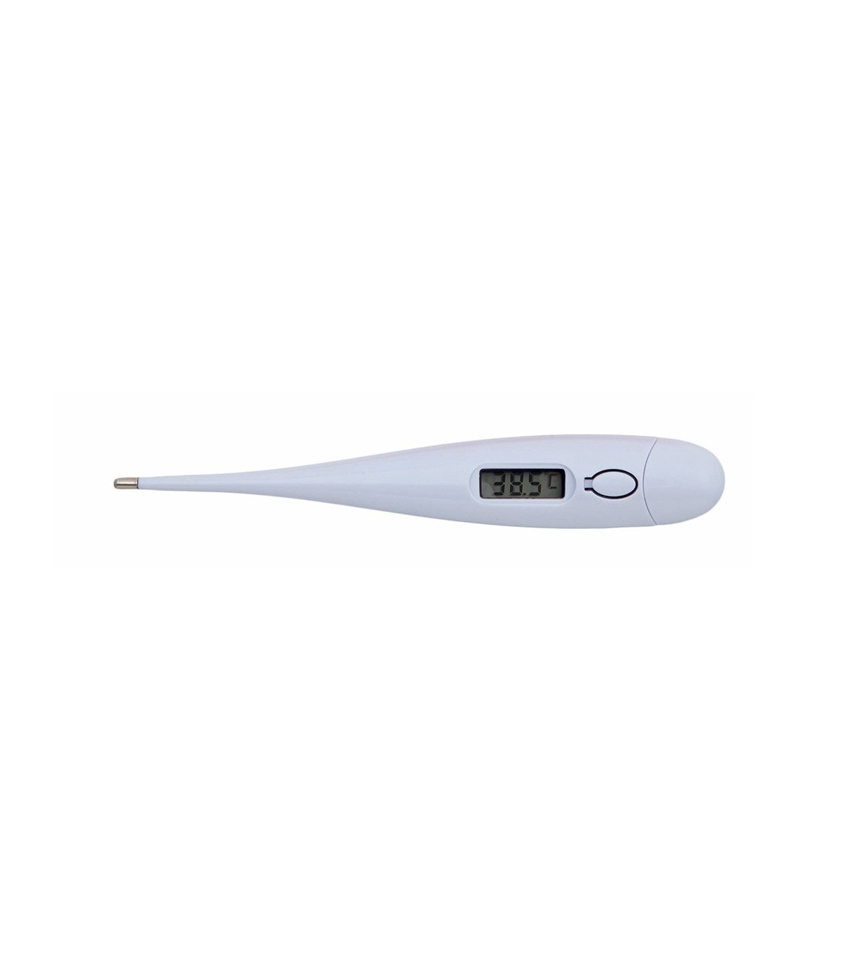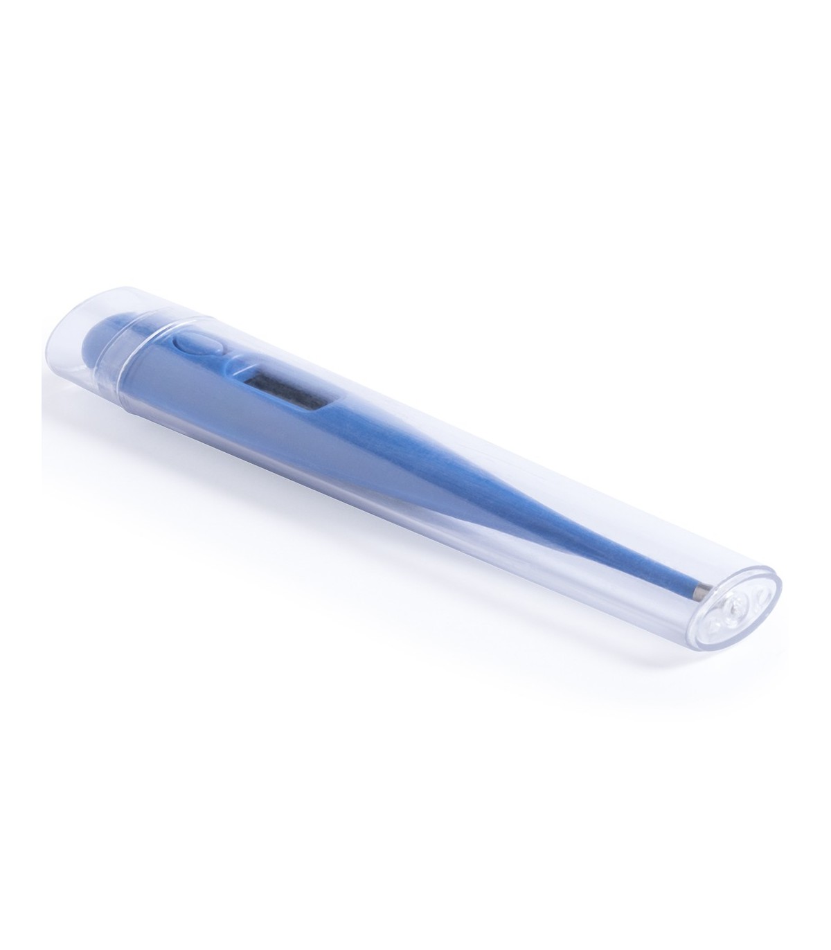 Termómetro digital de fácil uso en variada gama de colores. Presentado en resistente estuche transparente. Pilas de botón incluidas.
