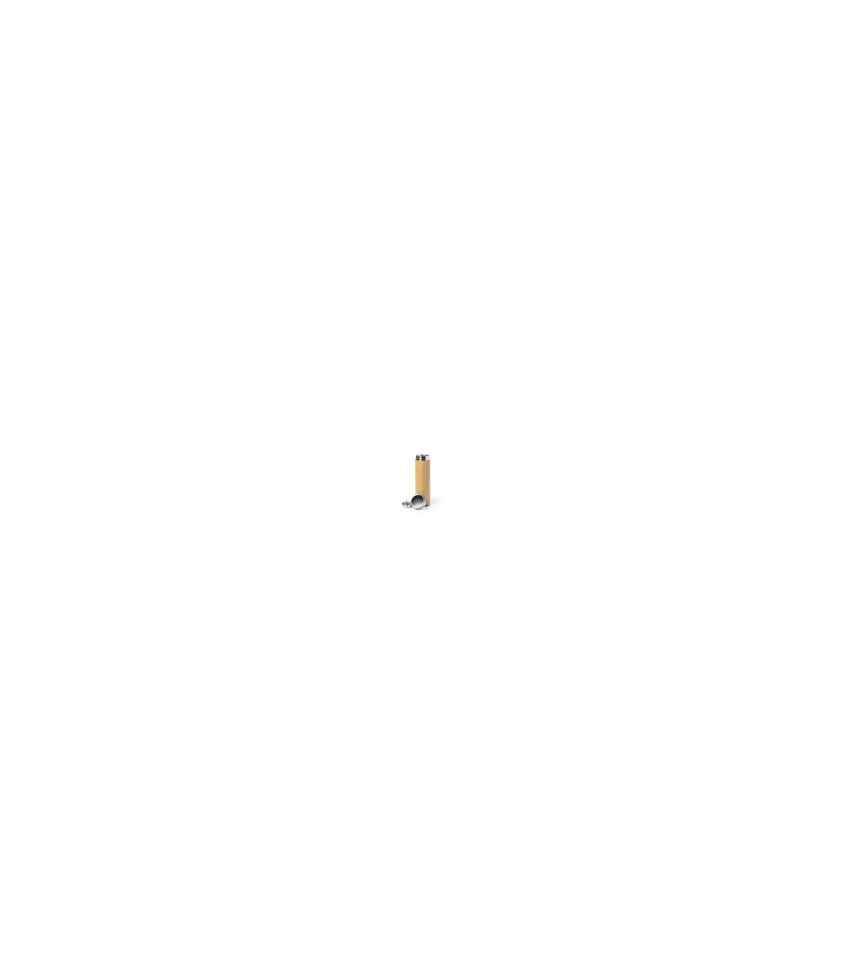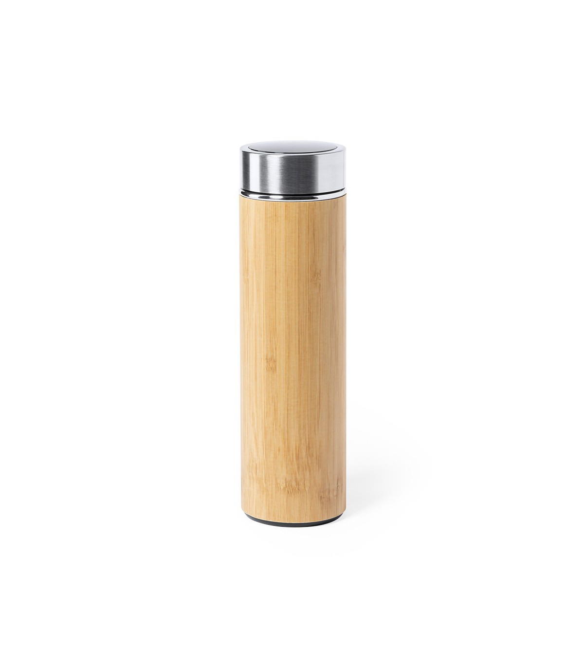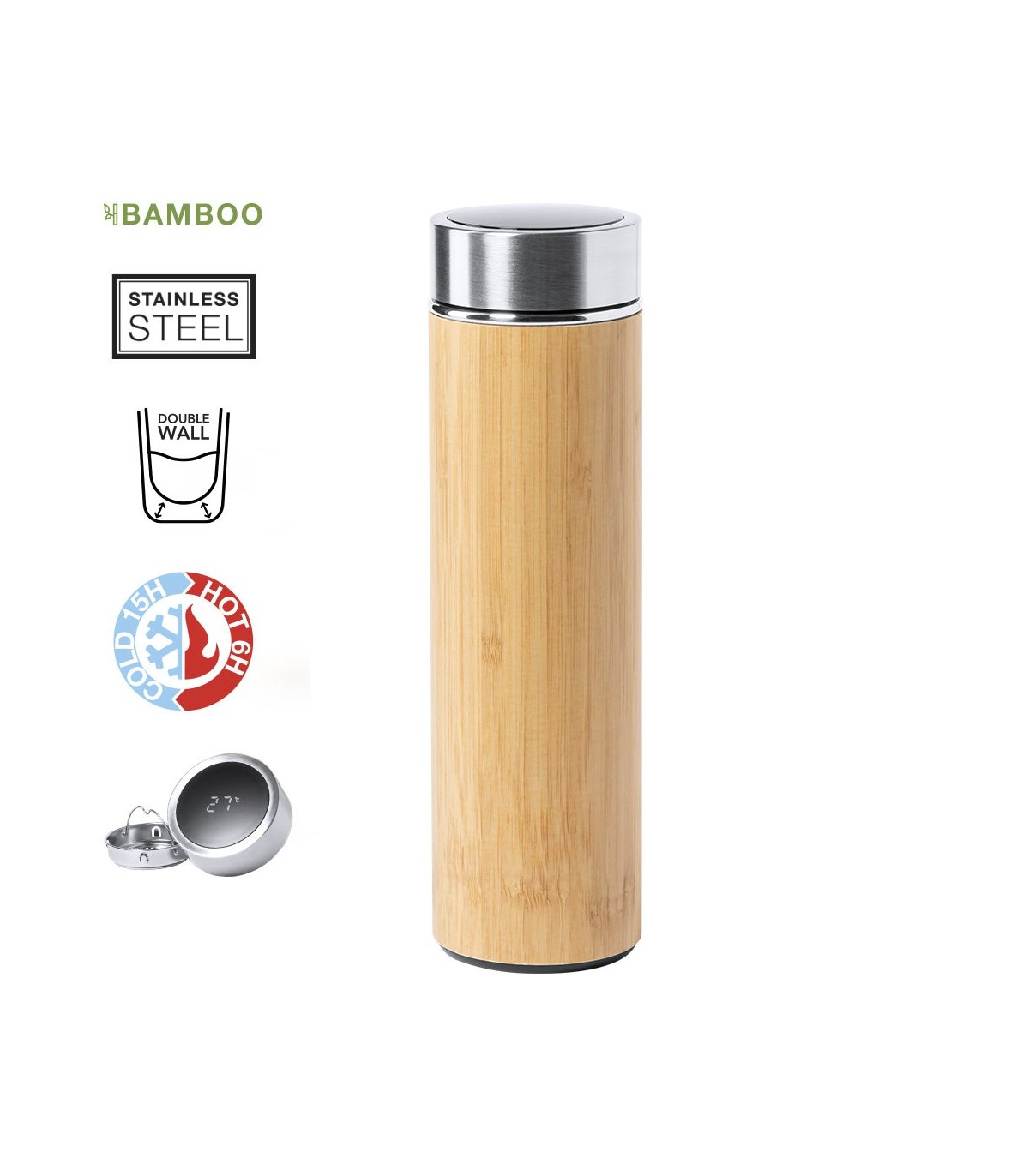 Termos acabado en bambú, de doble pared, con medidor de temperatura táctil integrado en tapón. 500 ml de capacidad, con tapón de seguridad libre de BPA e infusor.