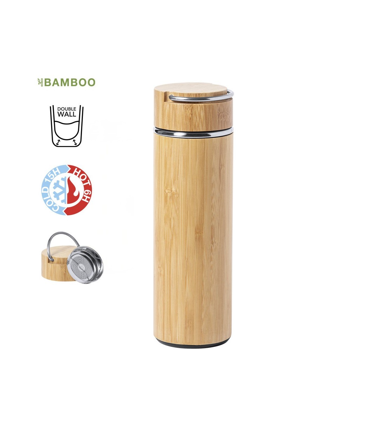 Termos en alta calidad acabado en bambú, de doble pared. 400 ml de capacidad, con tapón de seguridad libre de BPA e infusor integrado. Presentado en atractiva caja de diseño eco.