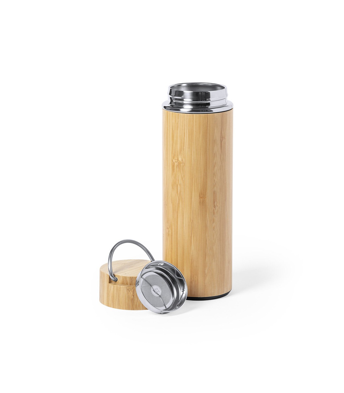 Termos acabado en bambú, de doble pared. 400 ml de capacidad, con tapón de seguridad libre de BPA e infusor integrado. Presentado en atractiva caja de diseño eco.