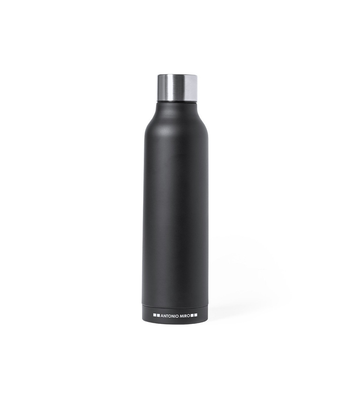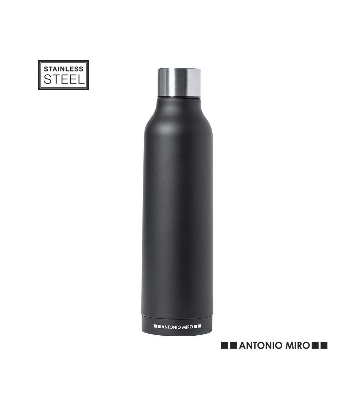 Termos en acero inox de Antonio Miró. De 500ml de capacidad y con doble pared, acabado en negro satinado, y con tapón cromado a rosca. Con logotipo de la marca.