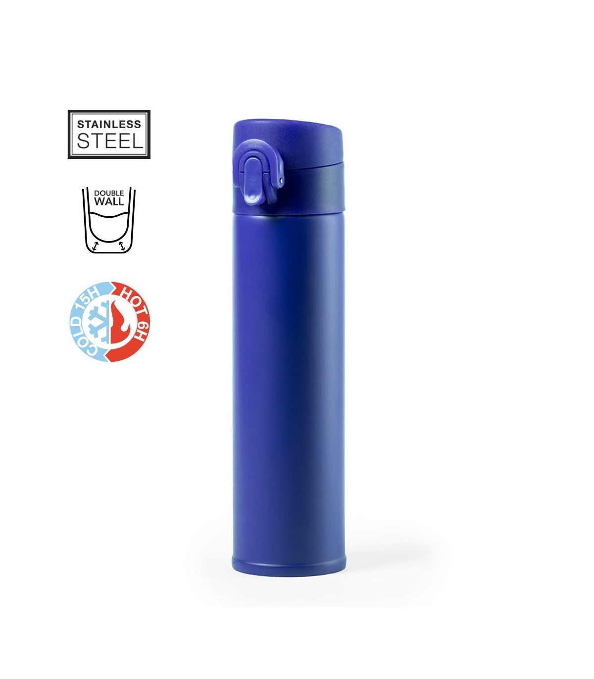 Termo en acero inox de 330ml de capacidad. Con doble cobertura para mejor y mas duradera conservación de la temperatura y con sistema de apertura fácil con botón. Disponibles en varios colores para personalizar y presentado individualmente en caja de diseño.