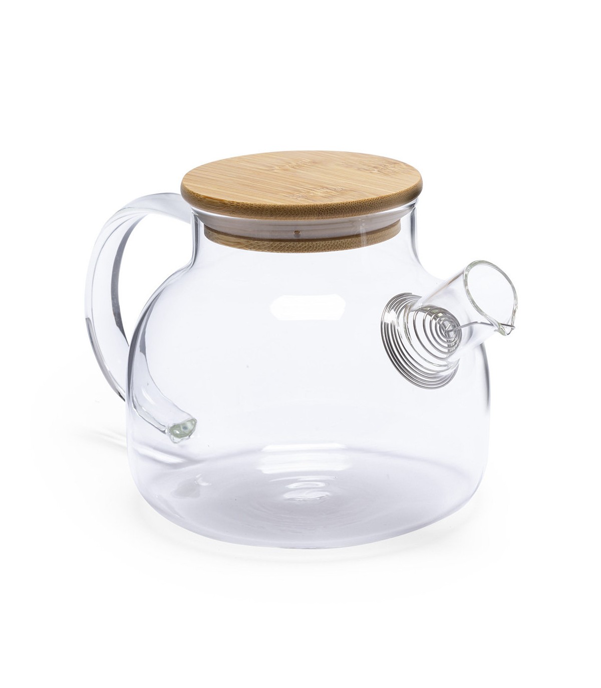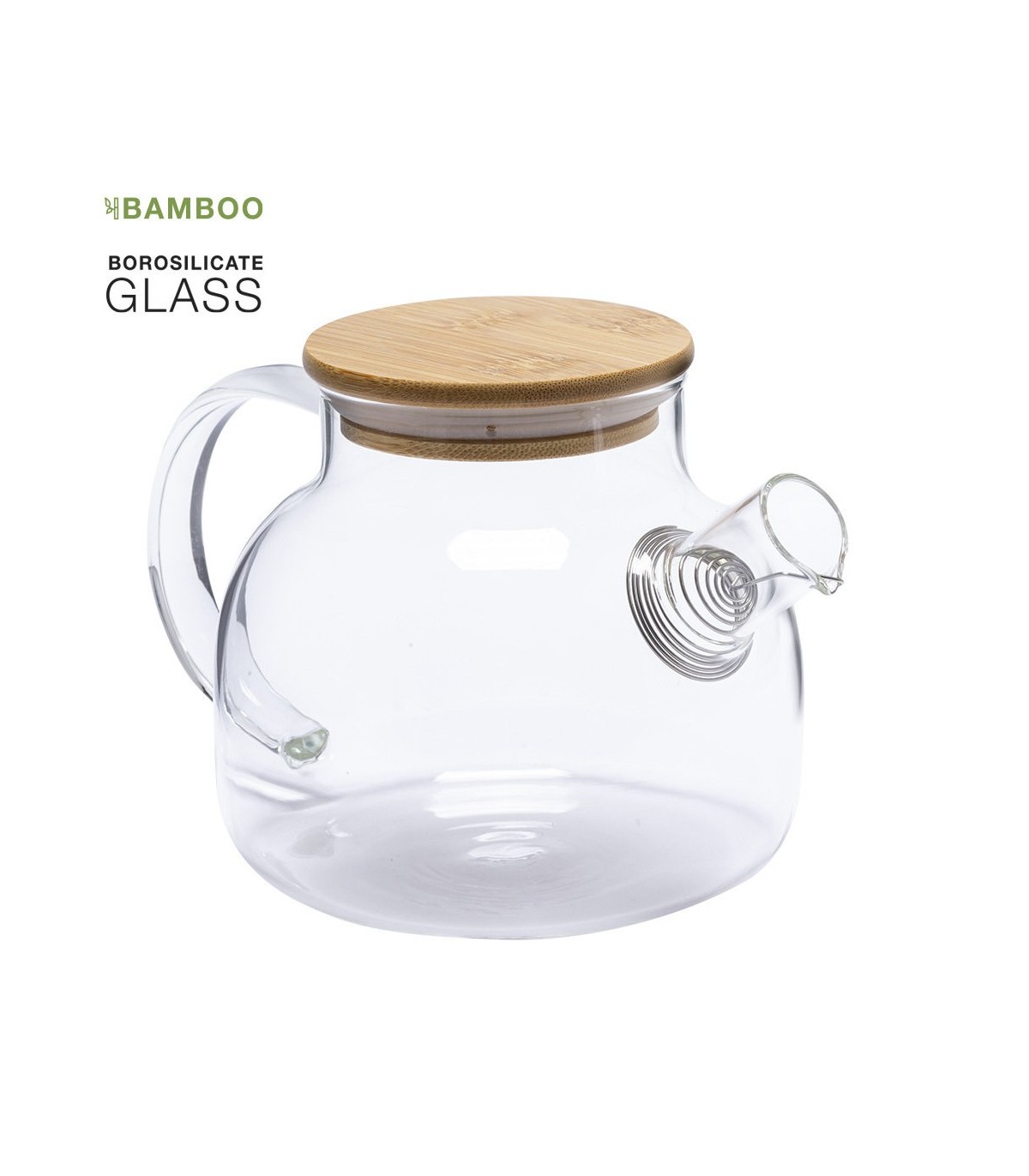 Tetera de1 Litro de capacidad, con infusor incluido. Fabricada en cristal de borosilicato y tapa en bambú, muy originales para regalos de empresa personalizados.