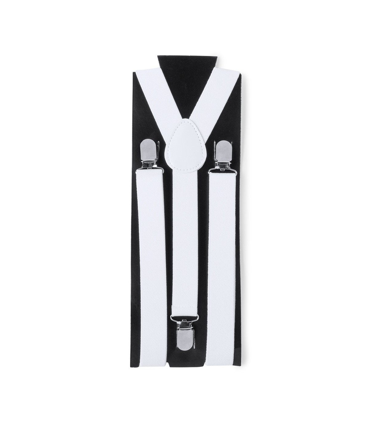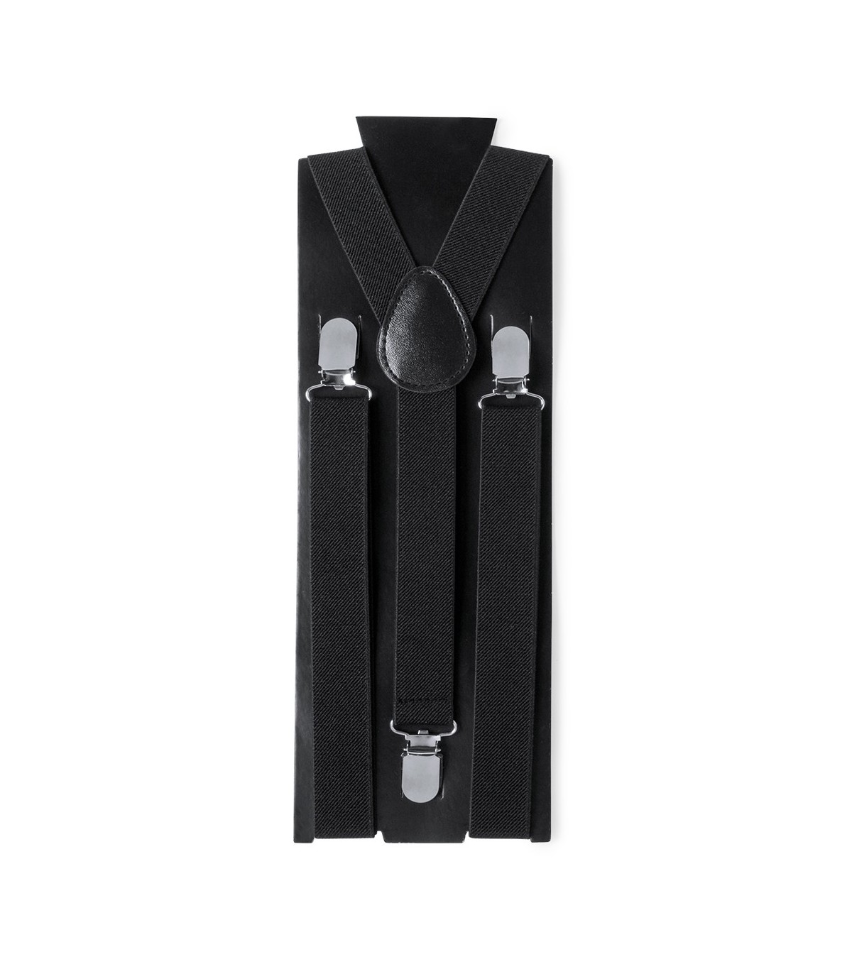 Tirántes elásticos de poliéster en sobrios colores con accesorios metálicos. Con refuerzo de polipiel en espalda a juego y presentados en original cartulina individual de color negro.
