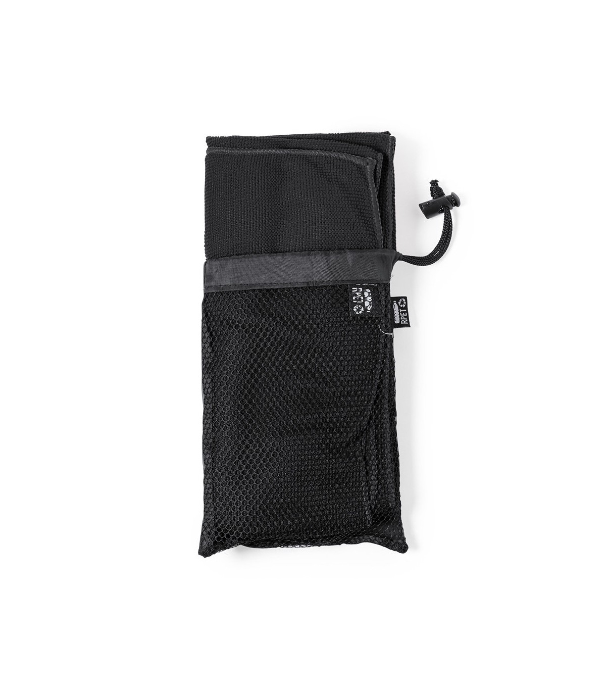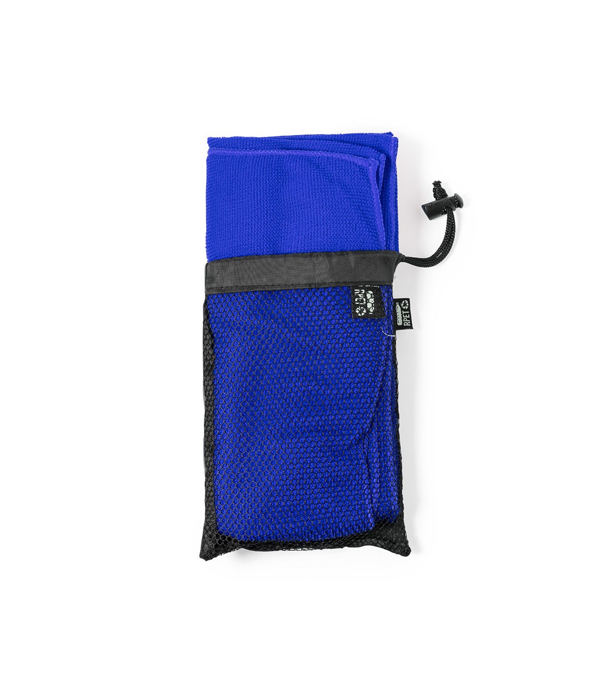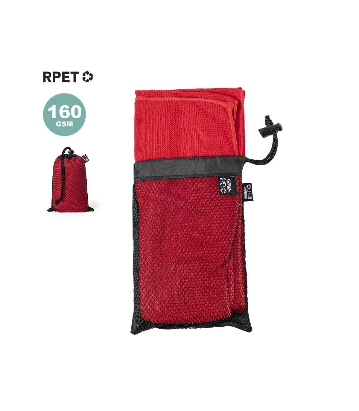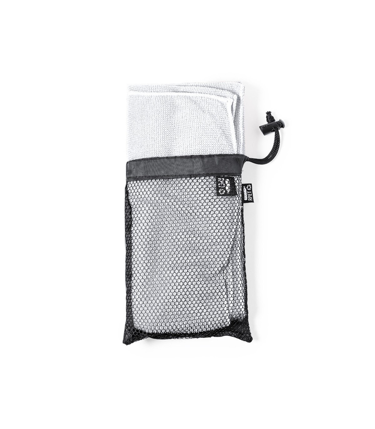Toallas absorbentes promocionales de RPET de 160g/m², con tamaño 50x100 cm, presentada en funda individual de redecilla RPET con parte trasera lisa.