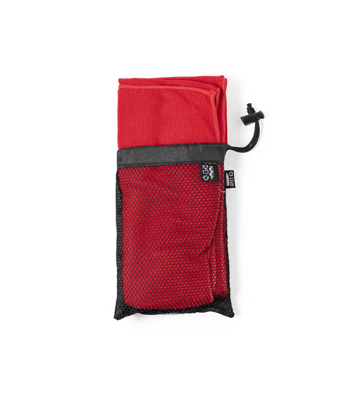 Toalla absorbente de línea nature. Fabricada en RPET de 160g/m2, elaborado a partir de plástico reciclado para así fomentar la reutilización de residuos plásticos y contribuir a la sostenibilidad del planeta. Tamaño 50x100 cm, presentada en funda individual de redecilla RPET con parte trasera lisa y disponible en diferentes colores para personalizar. Con distintivo RPET en etiqueta.