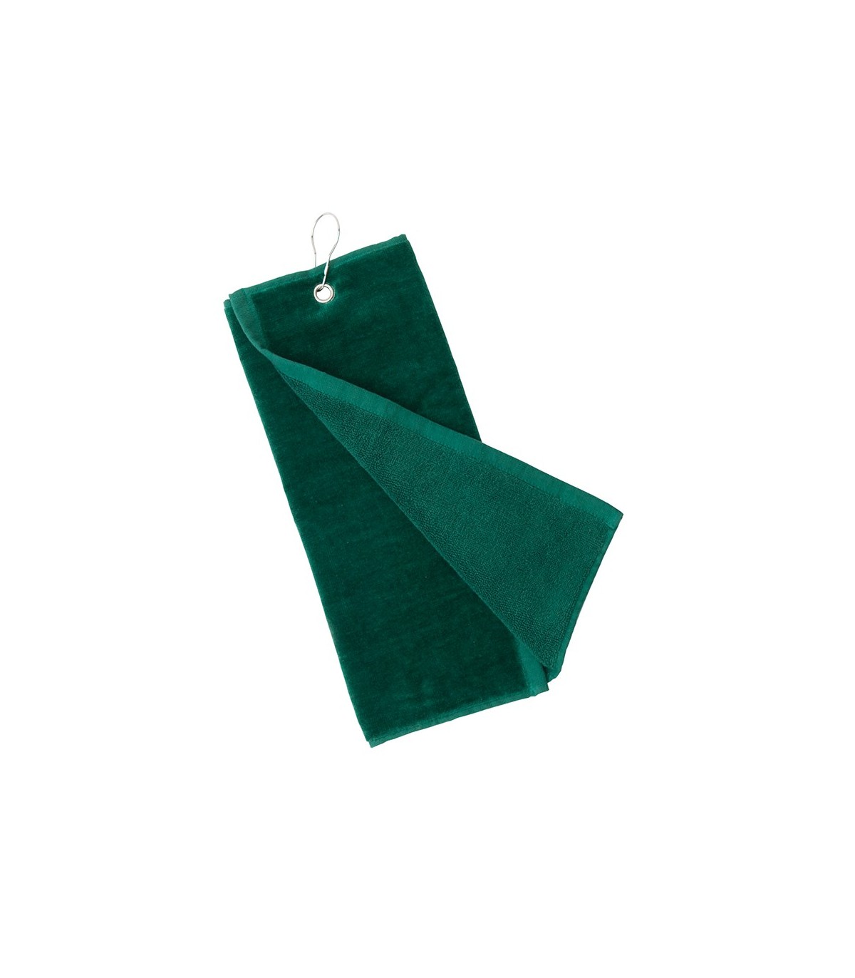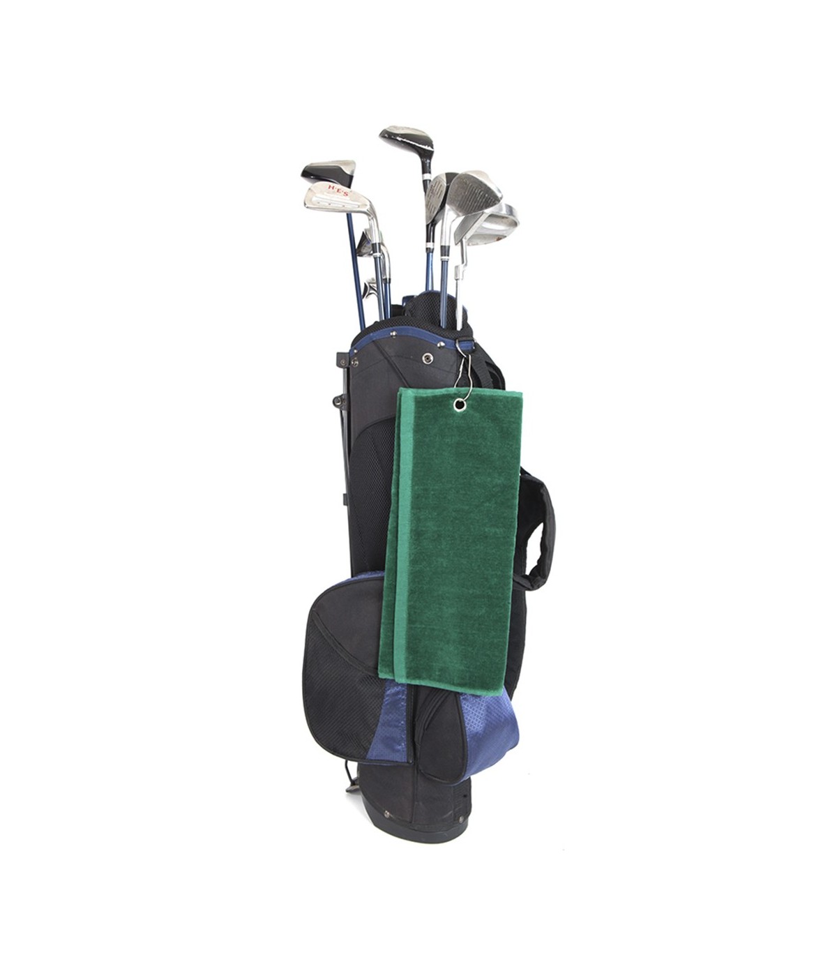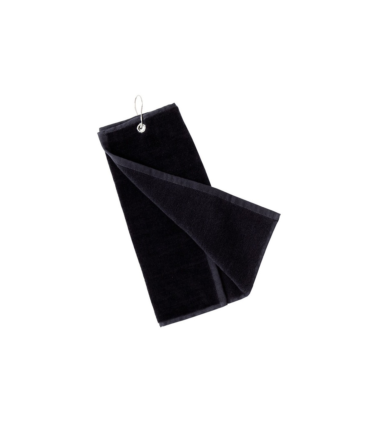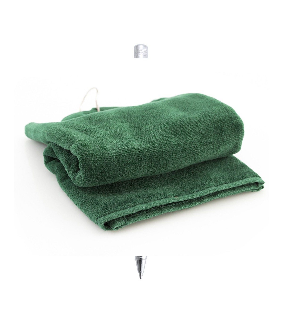 Toalla de golf de 40x50cm en absorbente y suave algodón de alta calidad de 650g/m2. Con argolla reforzada y mosquetón de acople, ambos de acero inox.