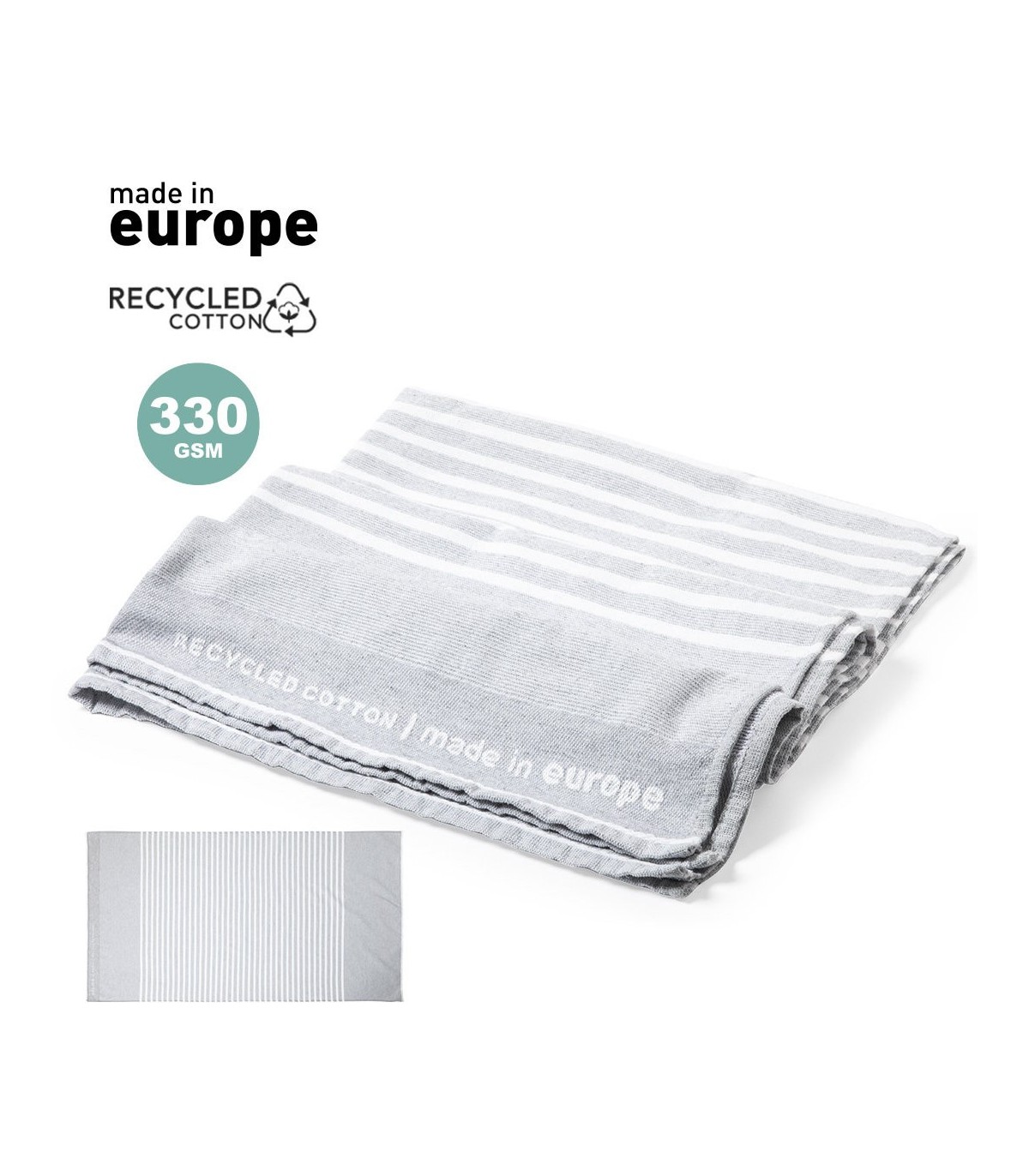 Toallas ecologicas personalizas hechas en algodón reciclado GRS y poliéster de 330g/m². Tamaño 150 x 80 cm.