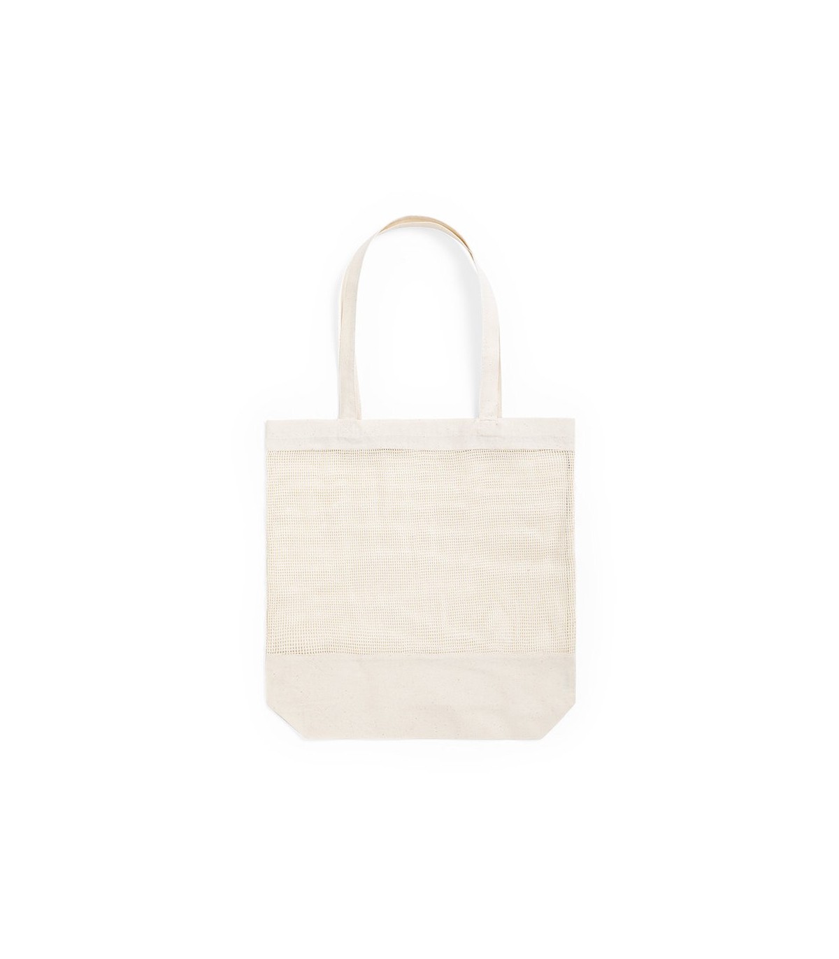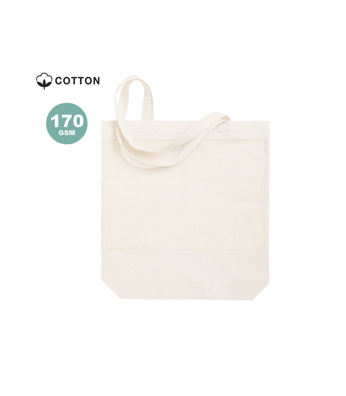 Totebag algodón de 170 g/m² y original acabado de rejilla. Asas largas en algodón, de 60 cm y reforzadas. Acabado cosido y resistencia hasta 8kg de peso.