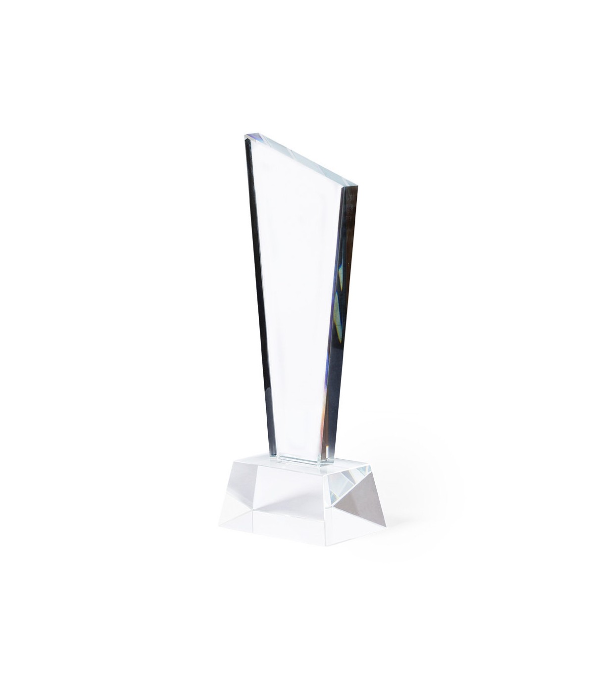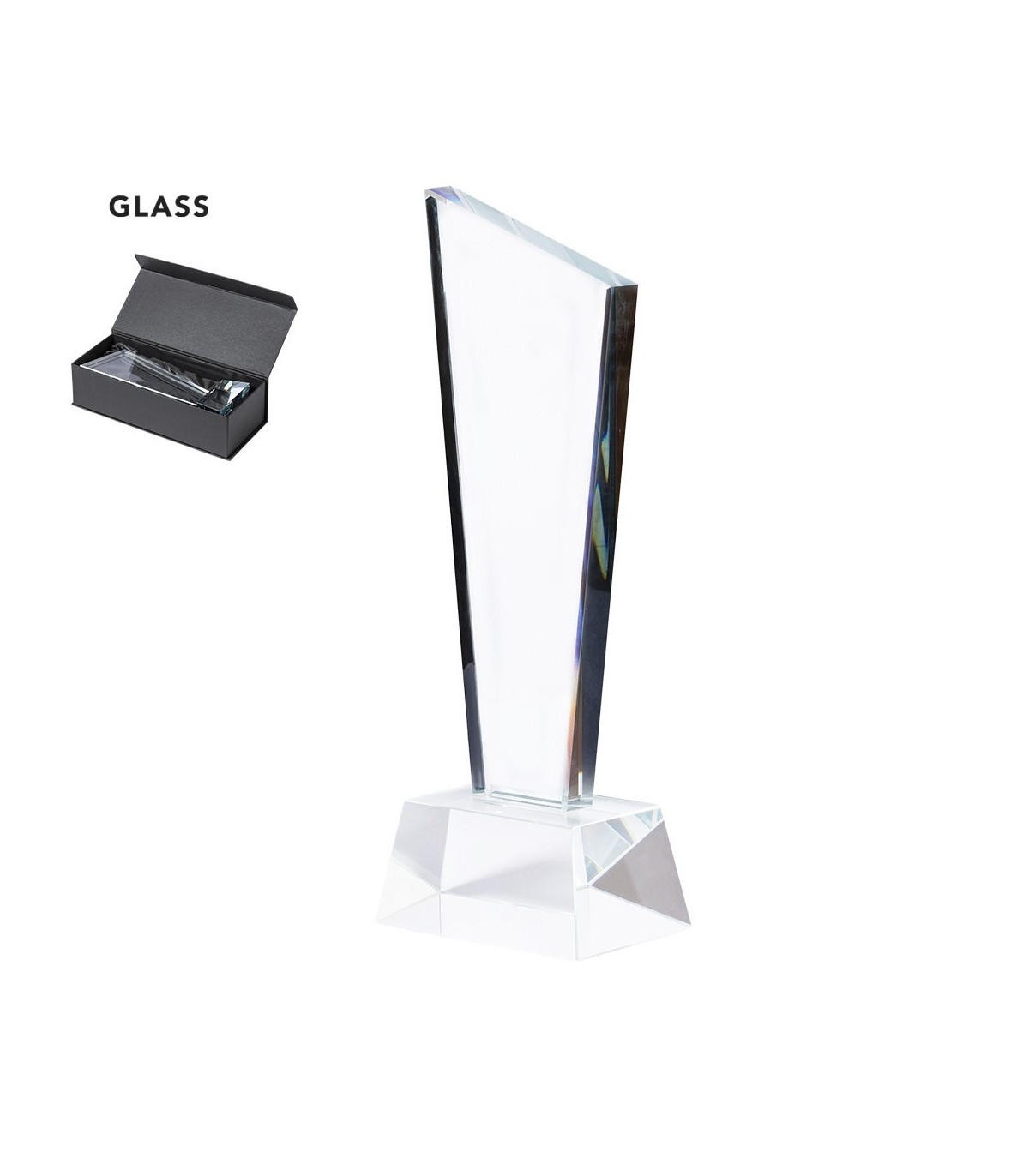 Trofeo de grueso cristal con original diseño y resistente base. Especialmente diseñado para marcaje a láser y presentado en estuche de protección en resistente cartón y cierre magnético, con interior troquelado en espuma.