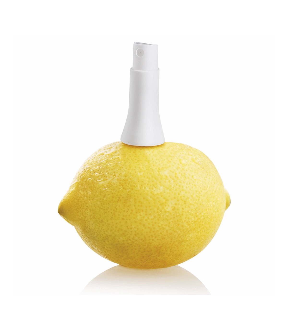 Original vaporizador para cítricos. Al presionar la base punzante sobre el cítrico se accede a su interior, y pulsando el vaporizador se extrae el líquido.