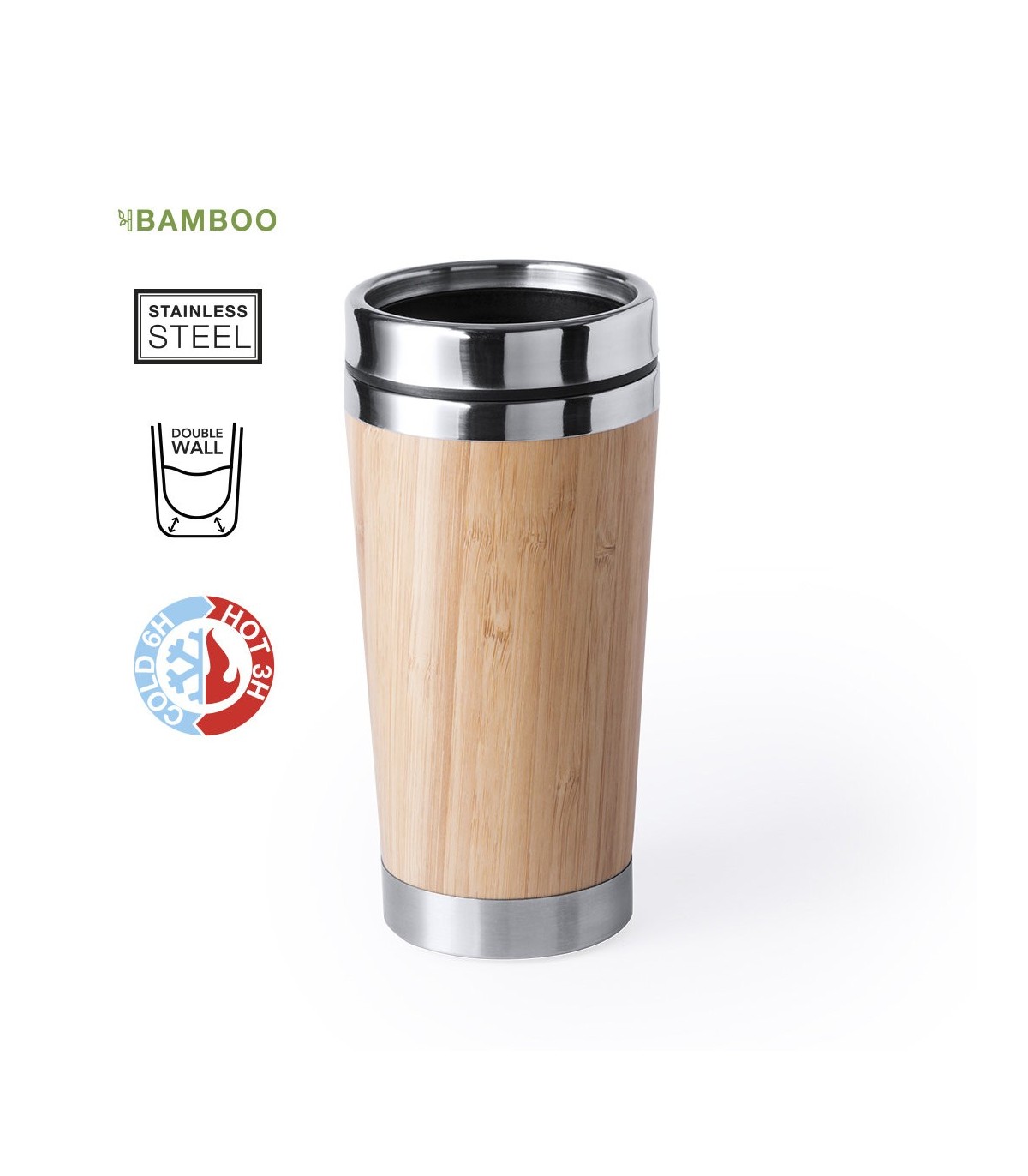 Vasos ecológicos con interior en acero inox y parte exterior en bambú. 500ml de capacidad, tapa dosificador de seguridad ideales para regalos publicitarios.