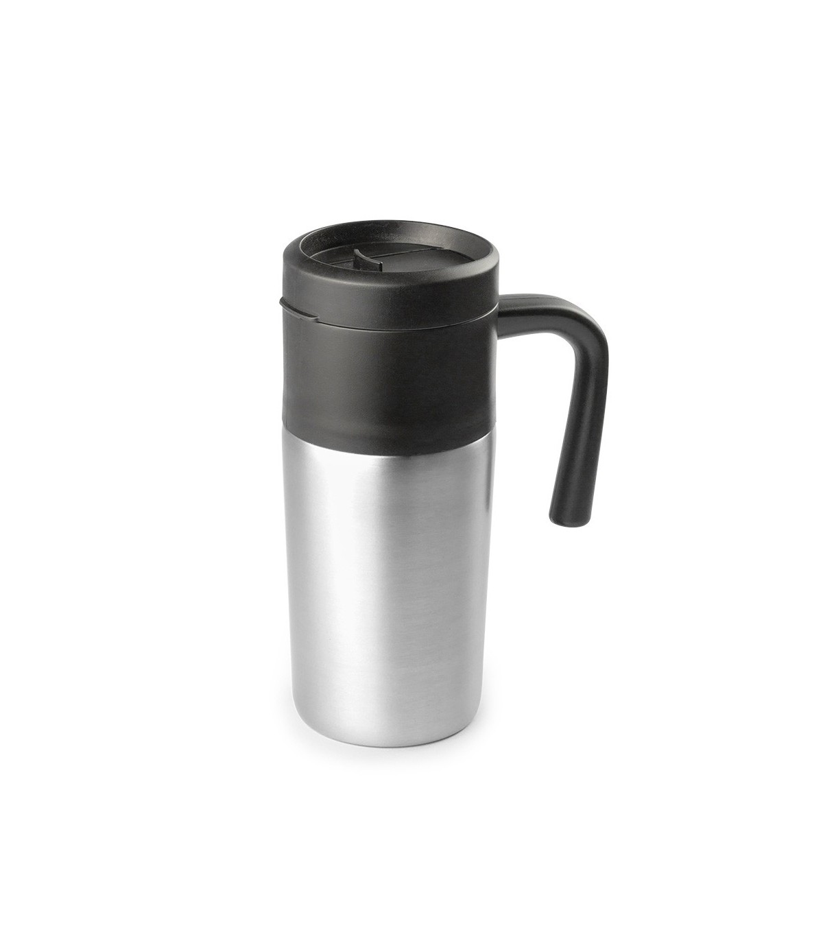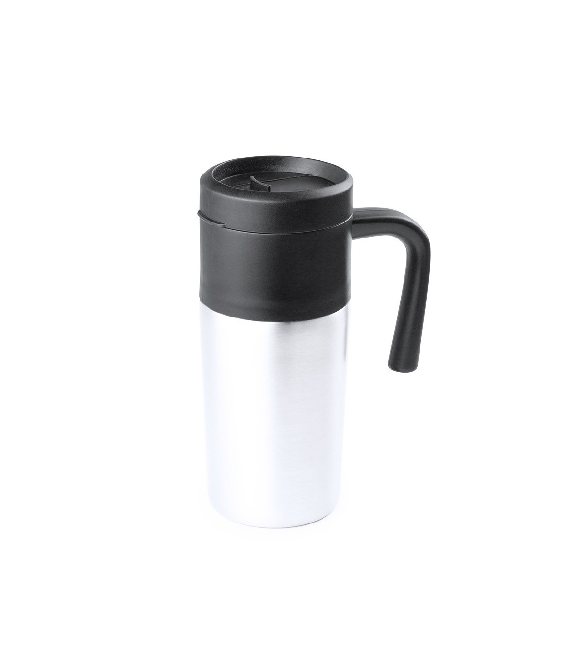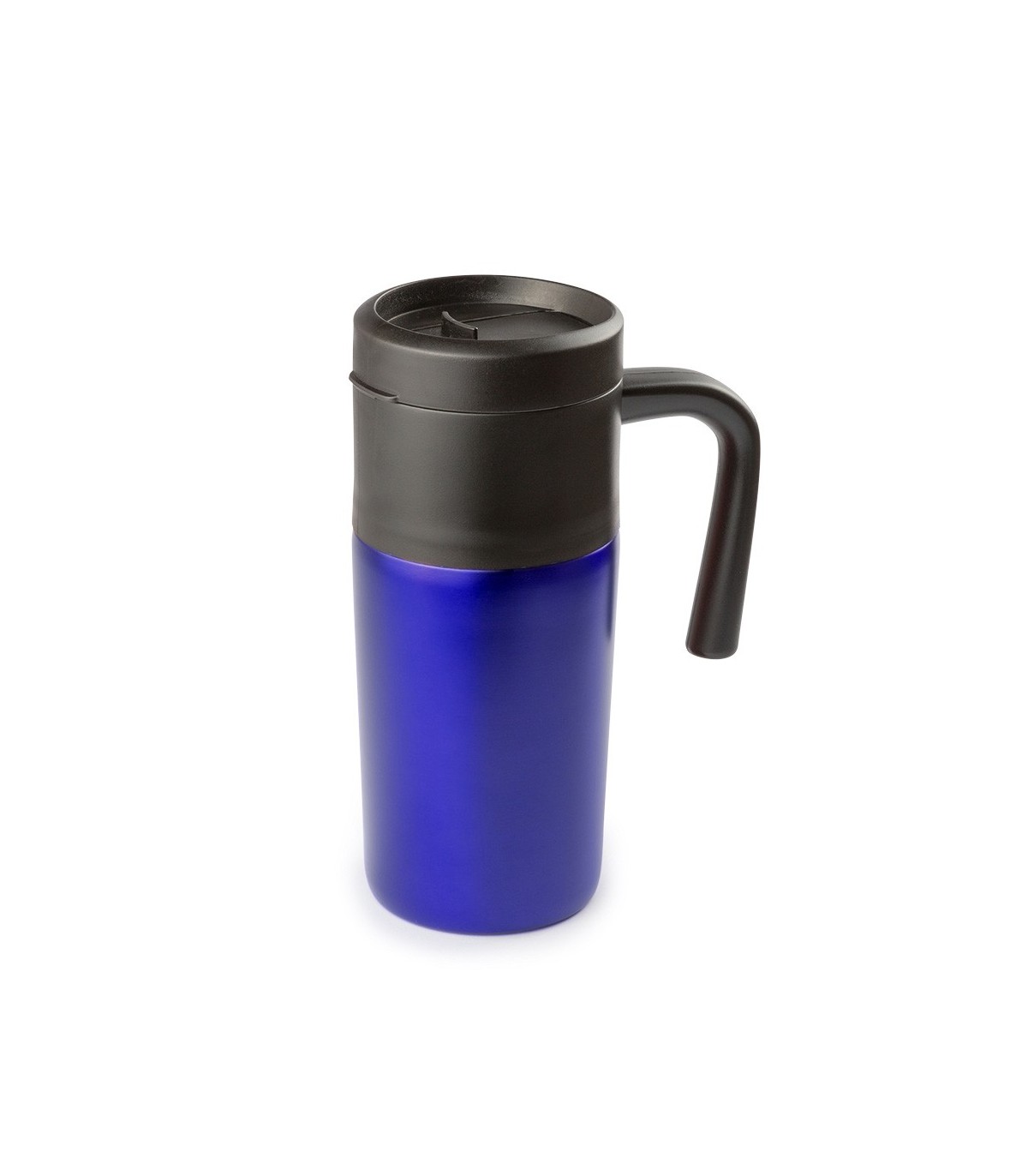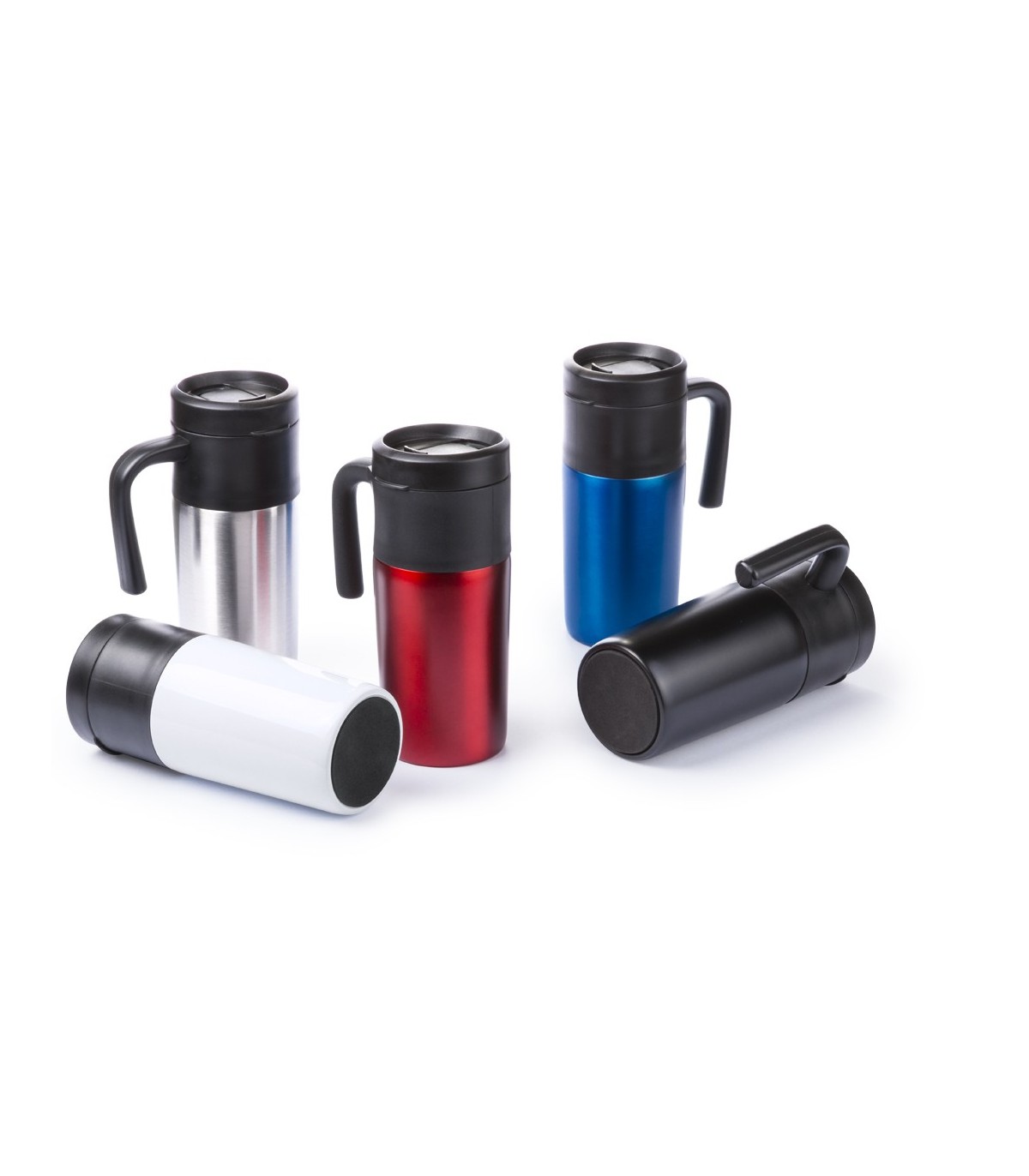 Taza de acero inox de 400ml de capacidad con cuerpo metalizado de vivos colores, en combinación con accesorios en negro. Con tapa dosificador y Presentación en embalaje individual.