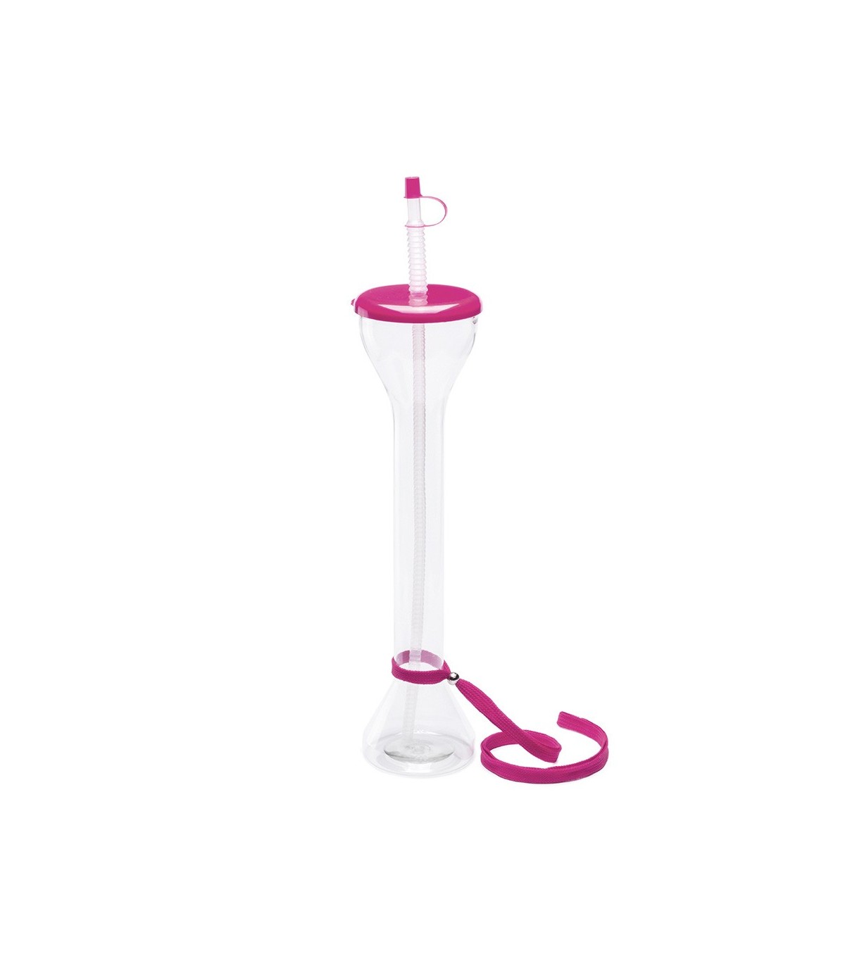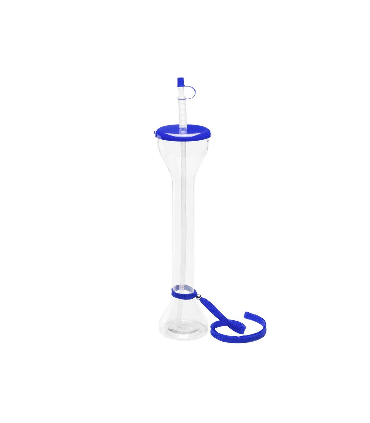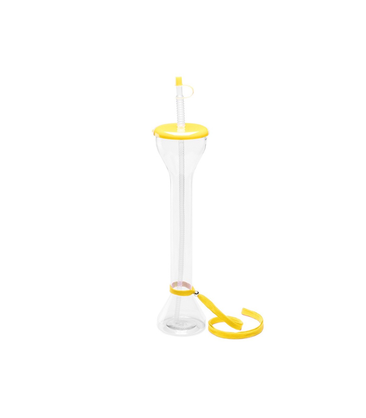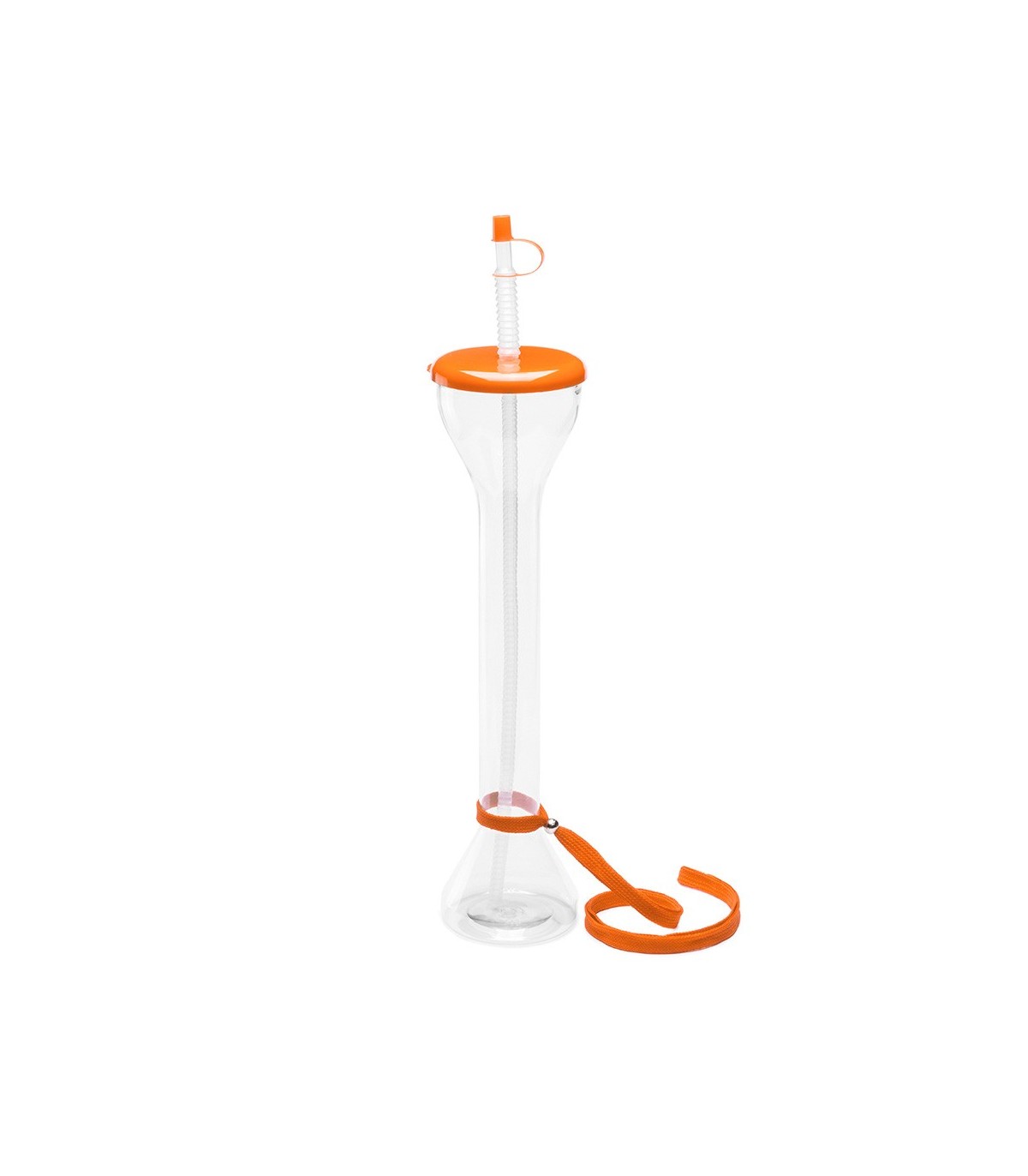 Divertido vaso de PET de 650ml de capacidad con cuerpo en transparente y accesorios en variada gama de vivos colores. Con pajita flexible y cinta de transporte en poliéster con accesorio de ajuste.