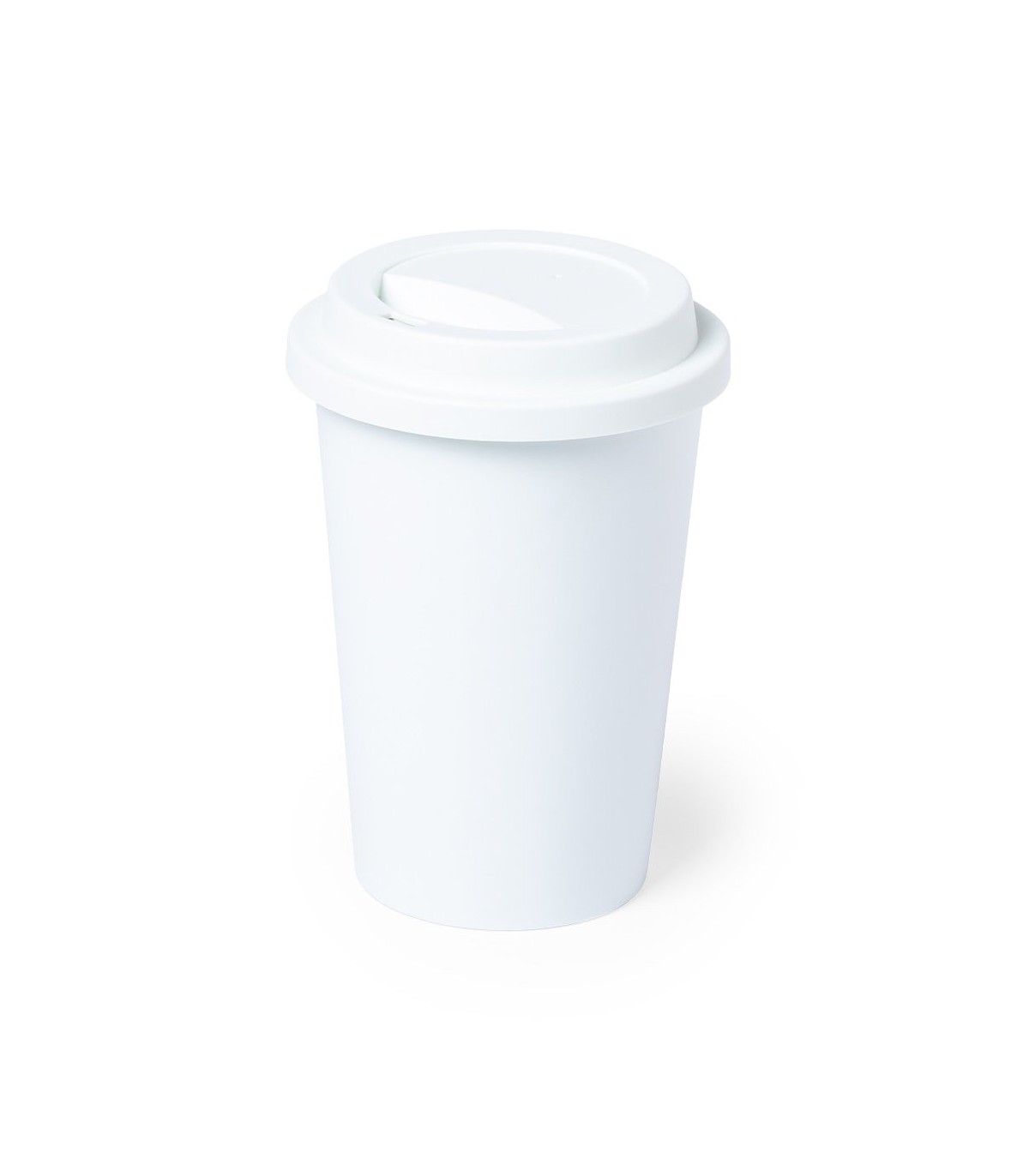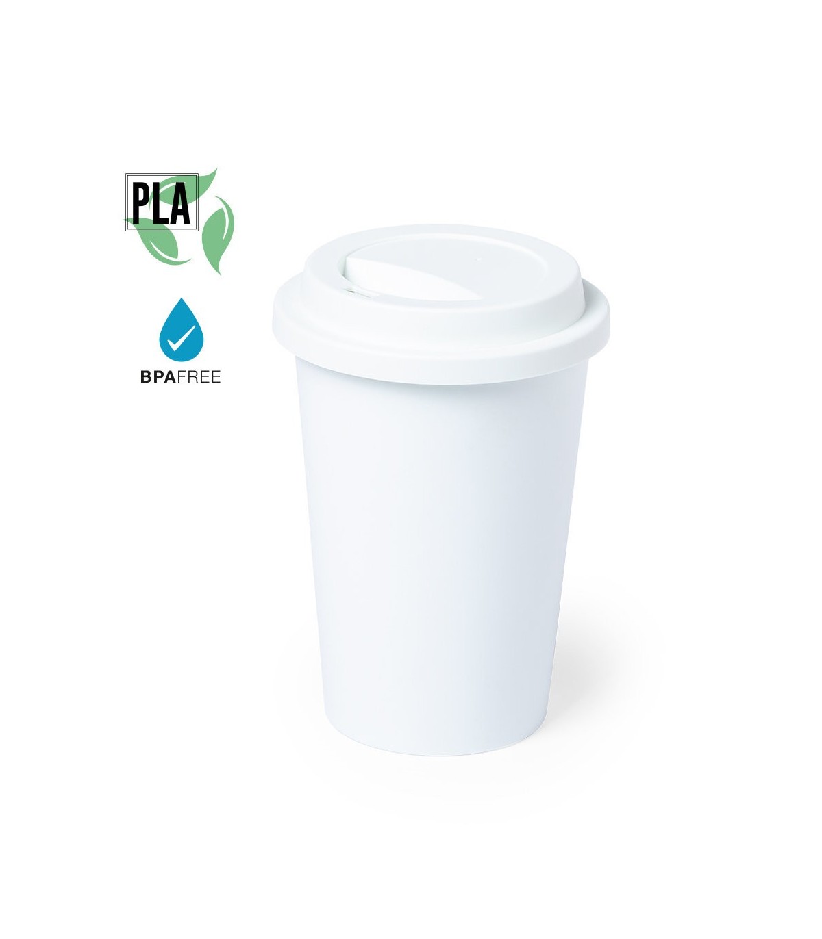 Vasos baratos personalizados hechos en PLA 100% compostable. 450ml de capacidad, con tapa dosificador de seguridad en mismo material, libre de BPA.