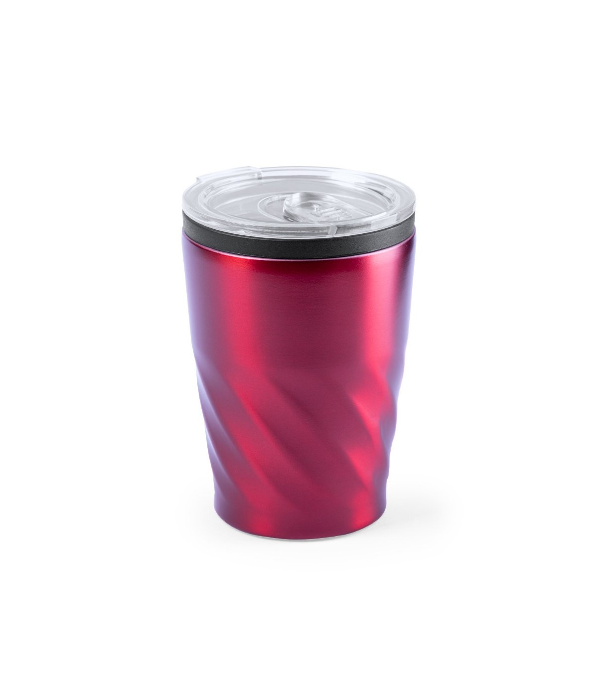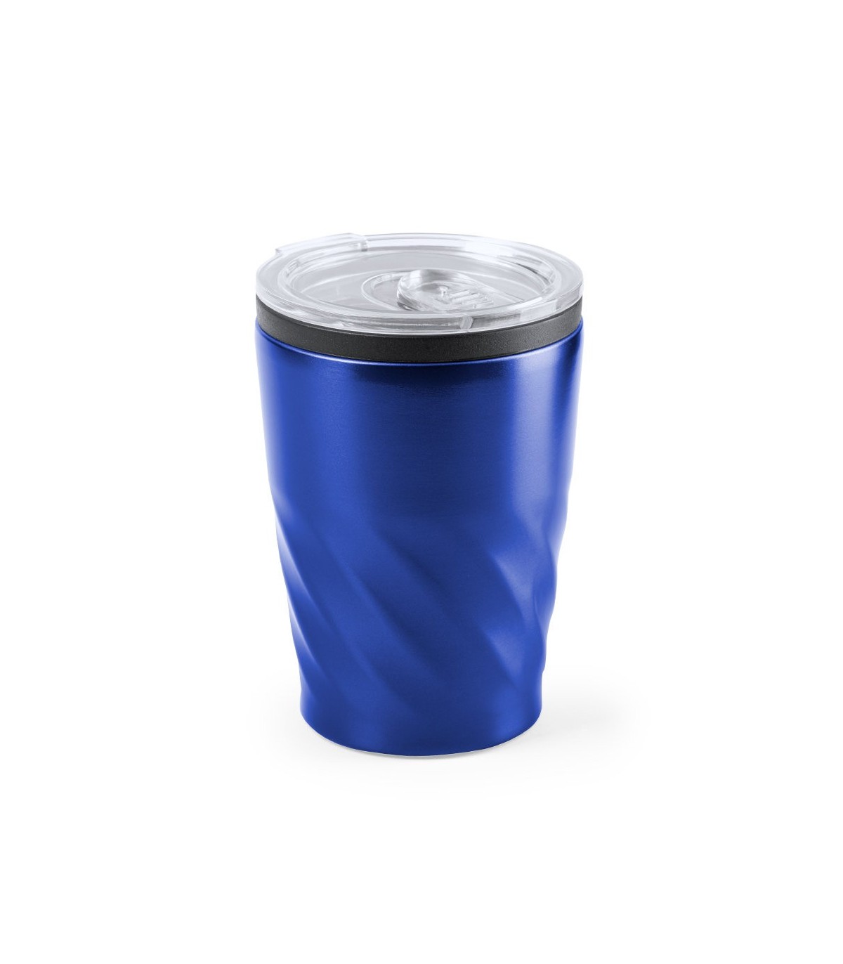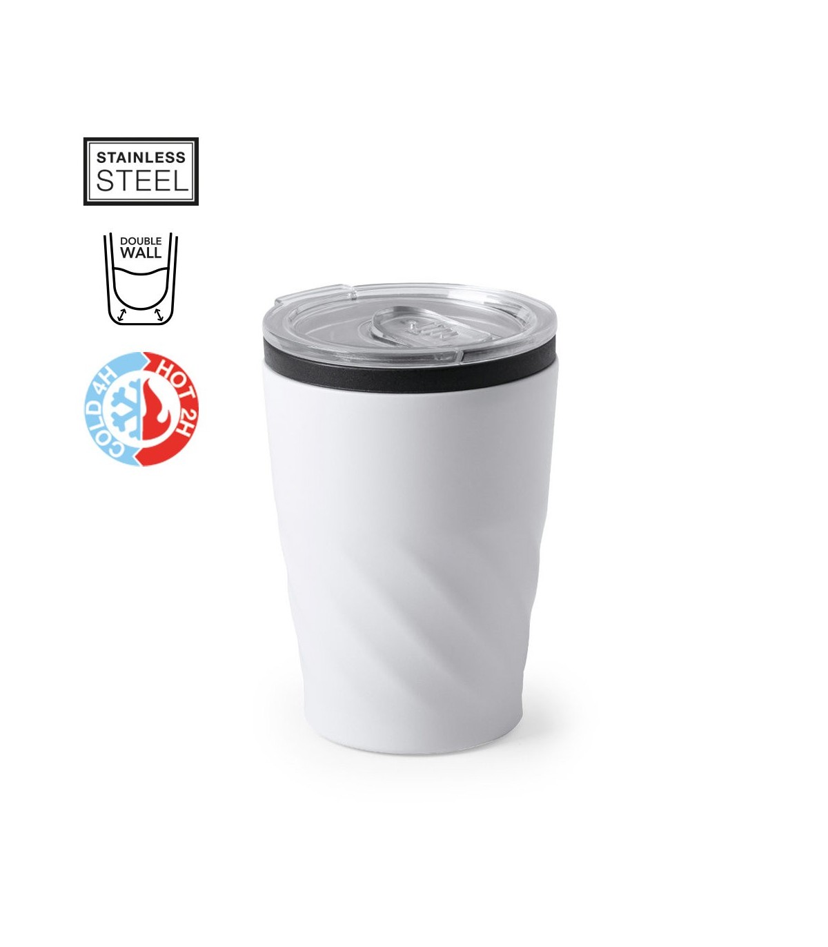 Vaso de 350ml de capacidad en acero inox. Cuerpo con diseño biselado, con anilla de color negro. Disponibles en varios colores para personalizar, con original tapón dosificador transparente y presentado individualmente en caja de diseño.