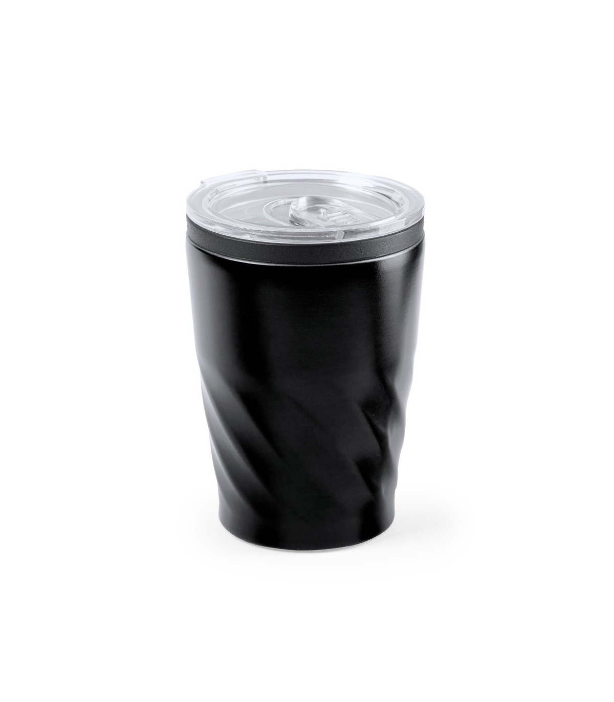Vasos personalizado de 350ml de capacidad en acero inox. con diseño biselado, anilla de color negro. con original tapón dosificador transparente.