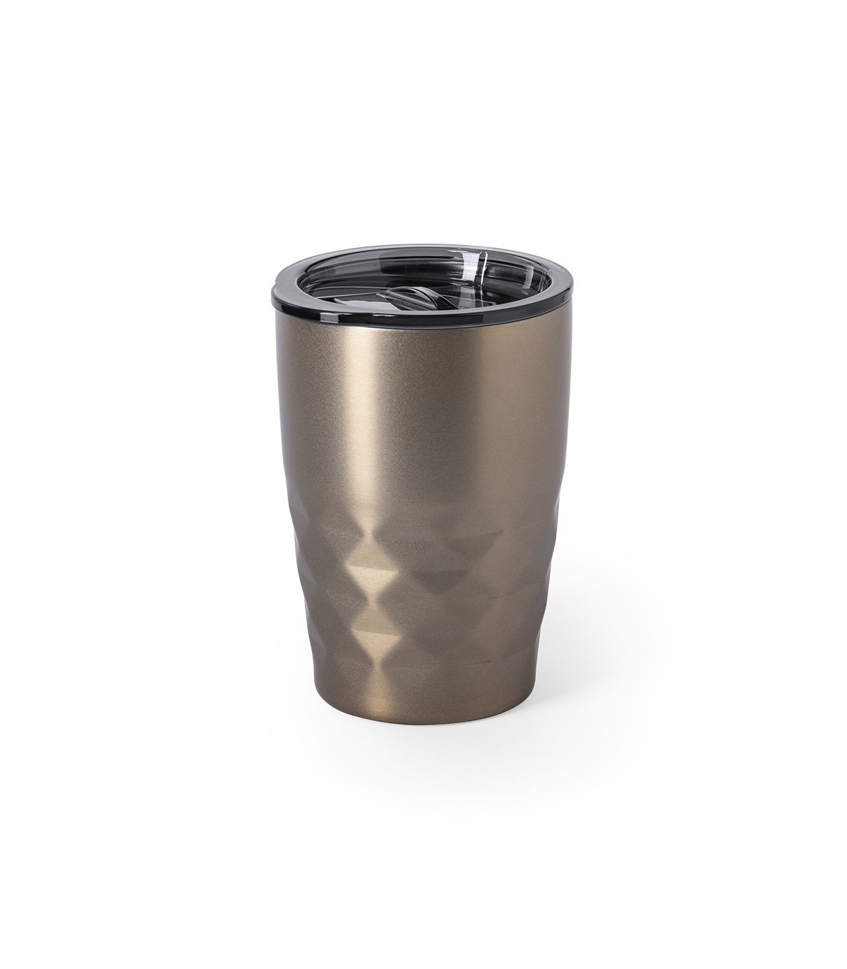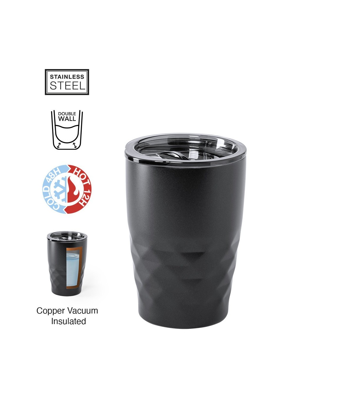 Vaso térmico de acero inoxidable, con doble capa y aislamiento de cobre al vacío. El mismo le permite mantener el calor y el frio durante un tiempo más prolongado, llegando a las 8 y 24 horas respectivamente. De 350ml de capacidad, yDisponibles en varios colores para personalizar metalizados. presentado individualmente en caja de diseño.