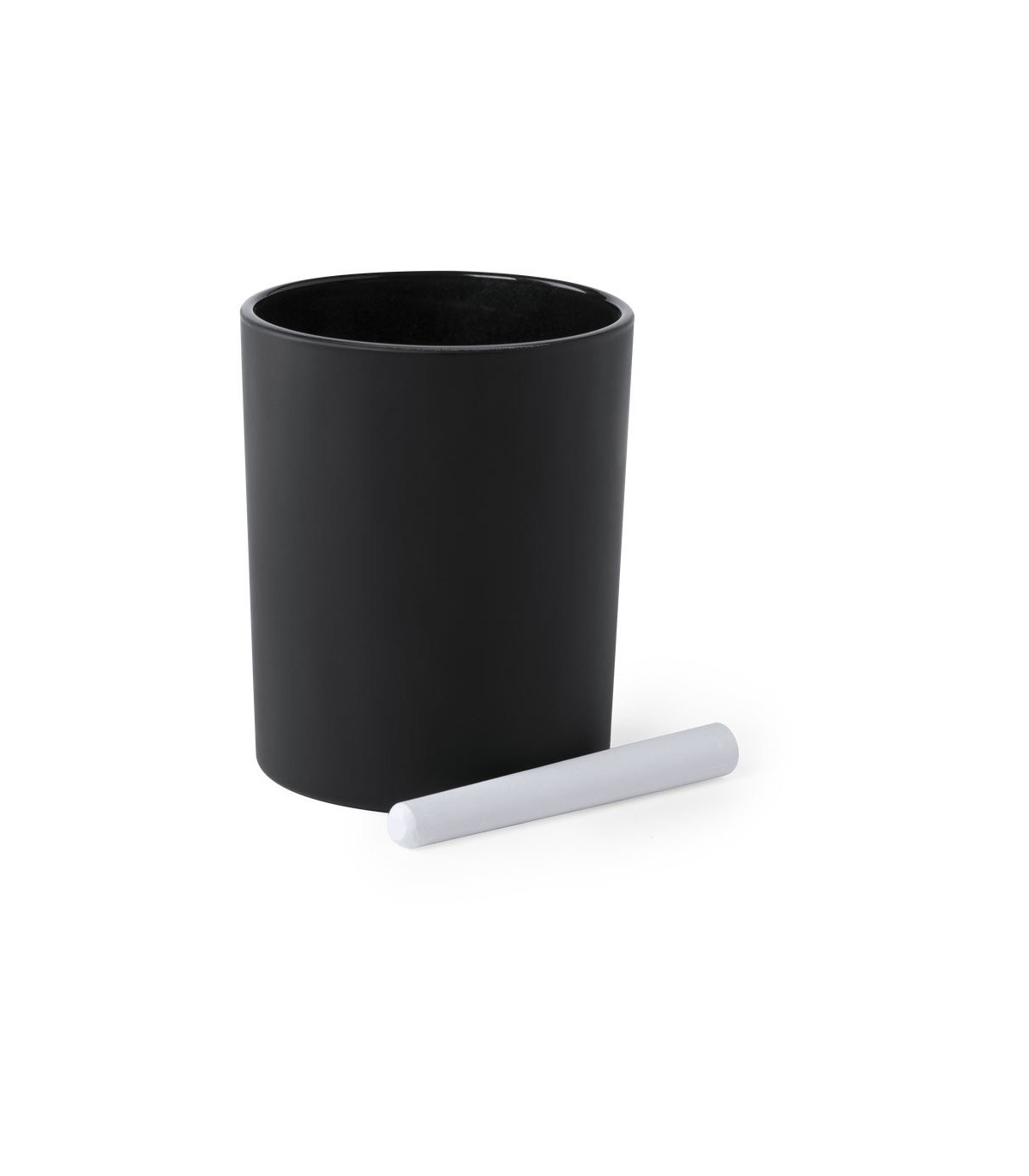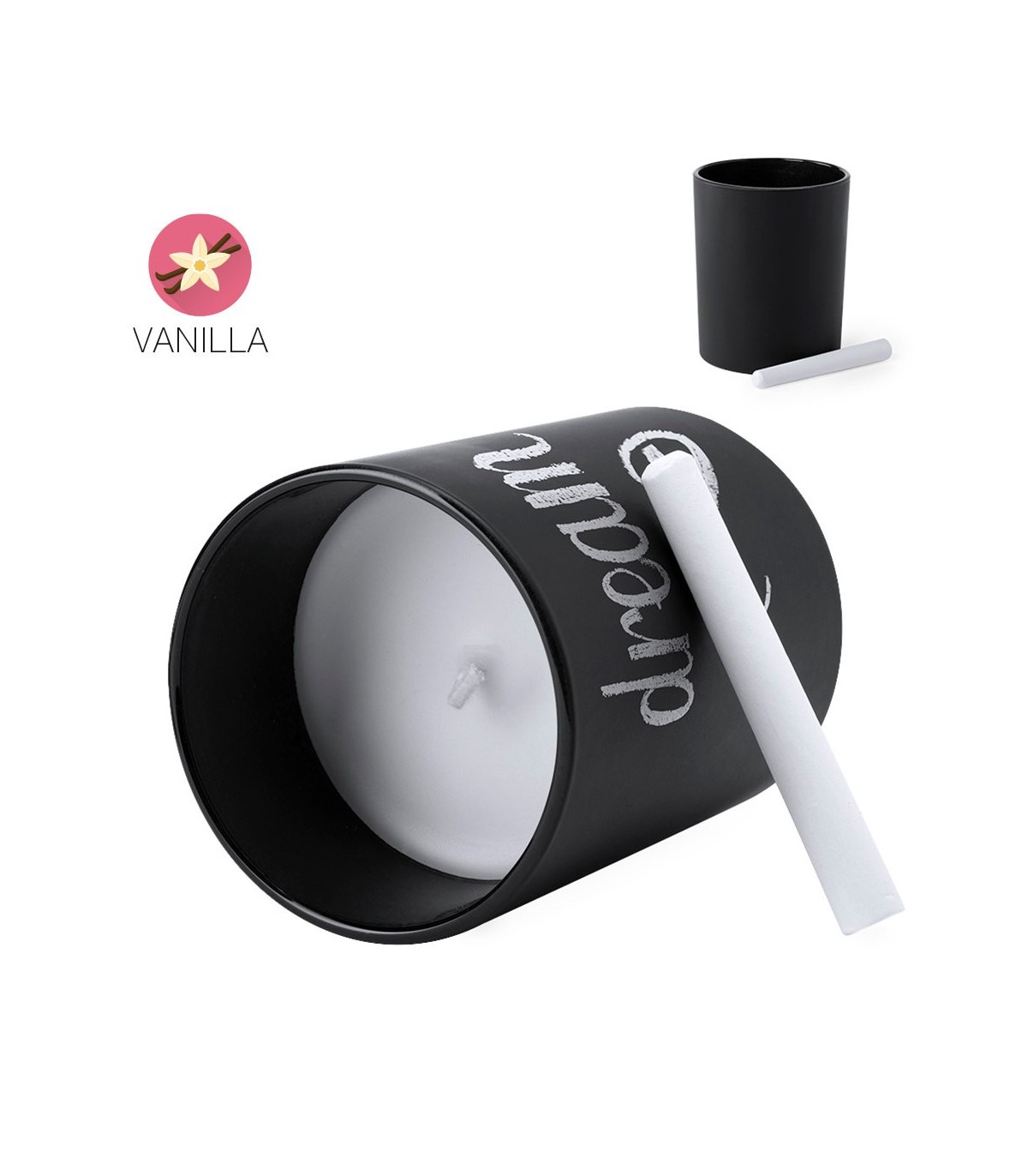 Vela aromática de fragancia vainilla presentada en original tarro pizarra para decorar. Tiza incluida y presentada en caja individual eco.